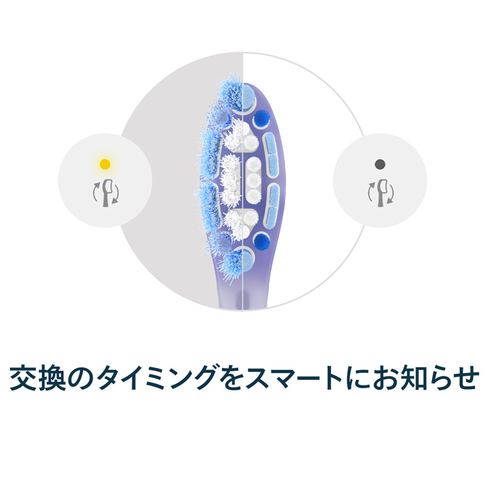 ブラシの一部の色が変わり、交換の時期をお知らせします。またハンドルの機種によってはブラシヘッド交換お知らせ機能(*)によりランプで時期をお知らせします。※交換目安:約3か月