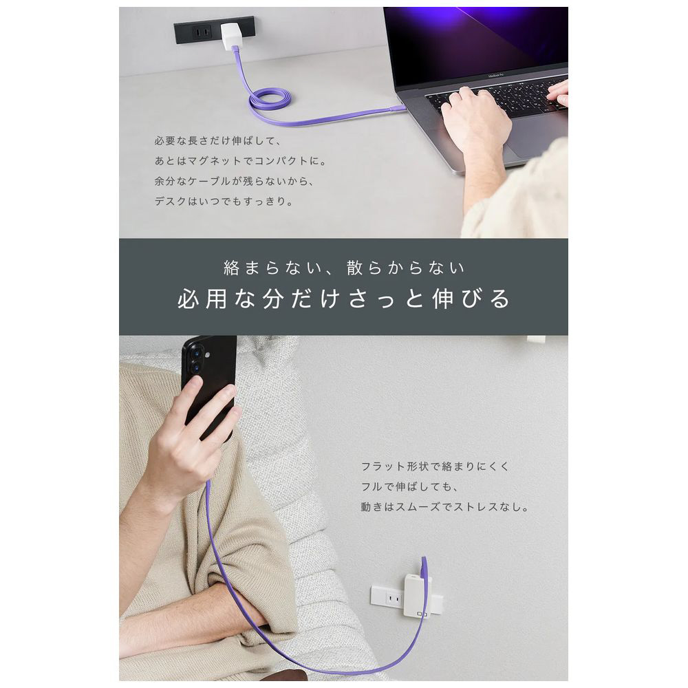 外出先でもデスク周りでも絡まず扱いやすく、高出力デバイスを効率よく充電したいユーザーに向けた、高性能&整理しやすいケーブルです。