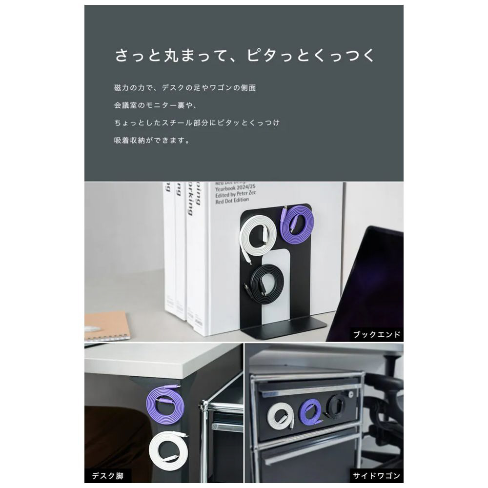 磁石を内蔵した薄いフラットタイプのUSB Cケーブル。コードリールのように、使う時は伸ばして、使い終われば厚みを抑えた渦巻き状に半自動的にくるくると巻き戻ります。