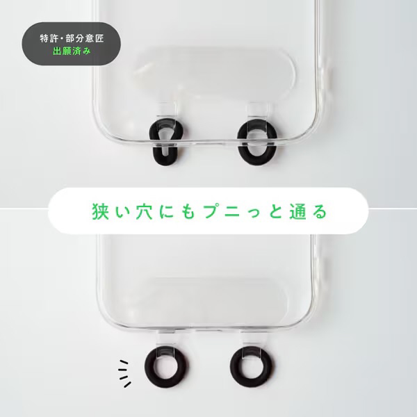 プニッと曲げて通すだけ。小さい穴にもOK。「ストラッパーグミ」は、スマホケースのスピーカー穴に通すだけで、ストラップホールを簡単に作れる2点吊り対応のストラッパーです。