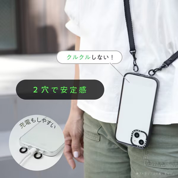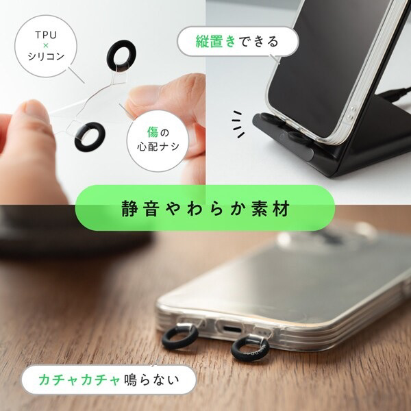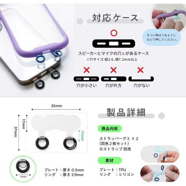 「ストラッパーグミ」は、スマホケースのスピーカー穴に通すだけで、ストラップホールを簡単に作れる2点吊り対応のストラッパーです。