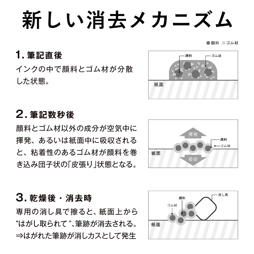 インクを『はがして消す』新発想。“消せる”の常識を変える新技術!文具メーカー3社(プラス株式会社、ぺんてる株式会社、セーラー万年筆株式会社)共同開発のインク「Que Sera」を搭載した、これまでにない“はがして消せる”ボールペン。手帳や日記、子どもの連絡帳など、間違えても専用消し具できちんと消して書き直せるから、書くことがもっと自由に楽しくなる。新発想のインクが実現した、新しいスタイルのボールペンです。