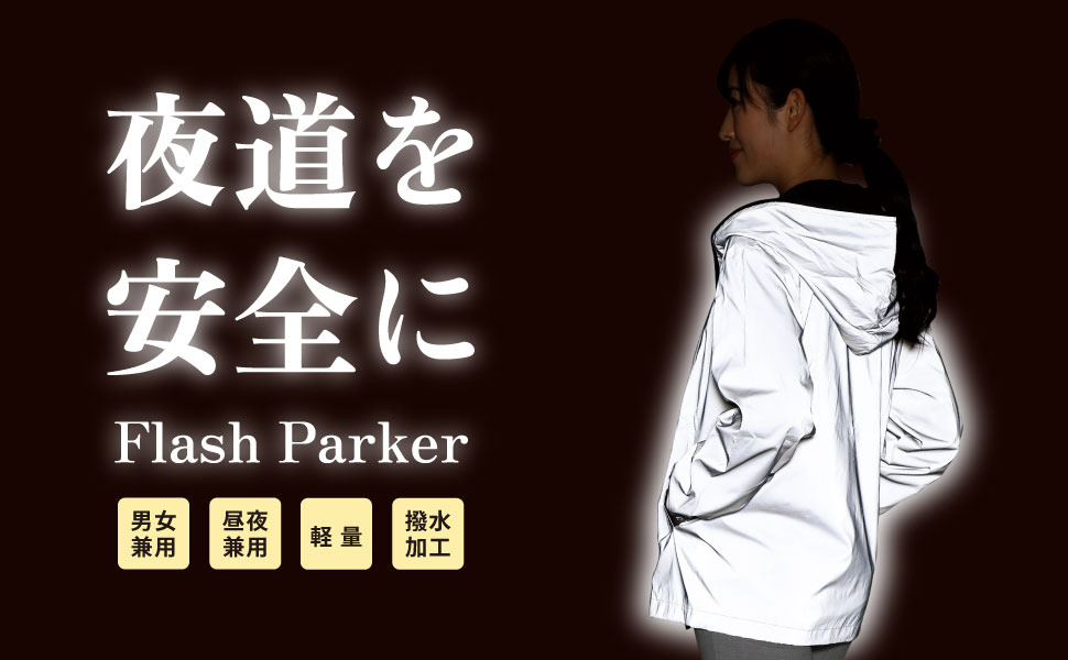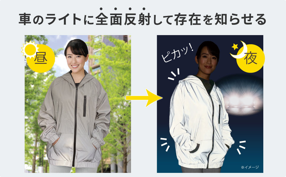 夜間も安心、光るフラッシュパーカー。パーカー全体が反射素材でできており、車のライトが当たると「ピカッ!」と光ります。