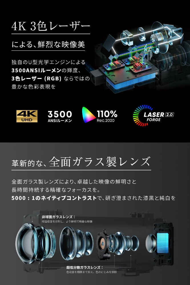 3色レーザー (RGB) による3500ANSIルーメンの圧倒的な明るさ、5000:1のコントラスト、全面ガラス製のレンズによる精緻な映像を。豊かな明暗表現と、正確無比な色彩表現を。