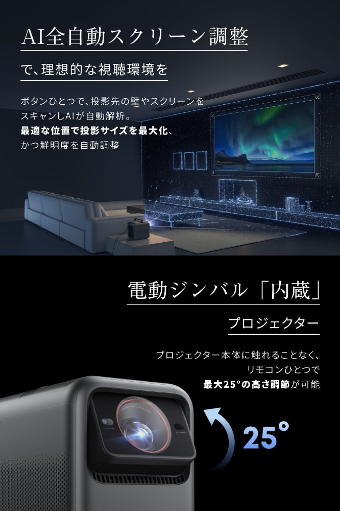 プロジェクター本体に内蔵された電動ジンバルにより、リモコンで最大25°の高さ調整が可能。また、AI全自動スクリーン調整によりボタンひとつで、映像が最も美しく映える投影位置を自動調節。