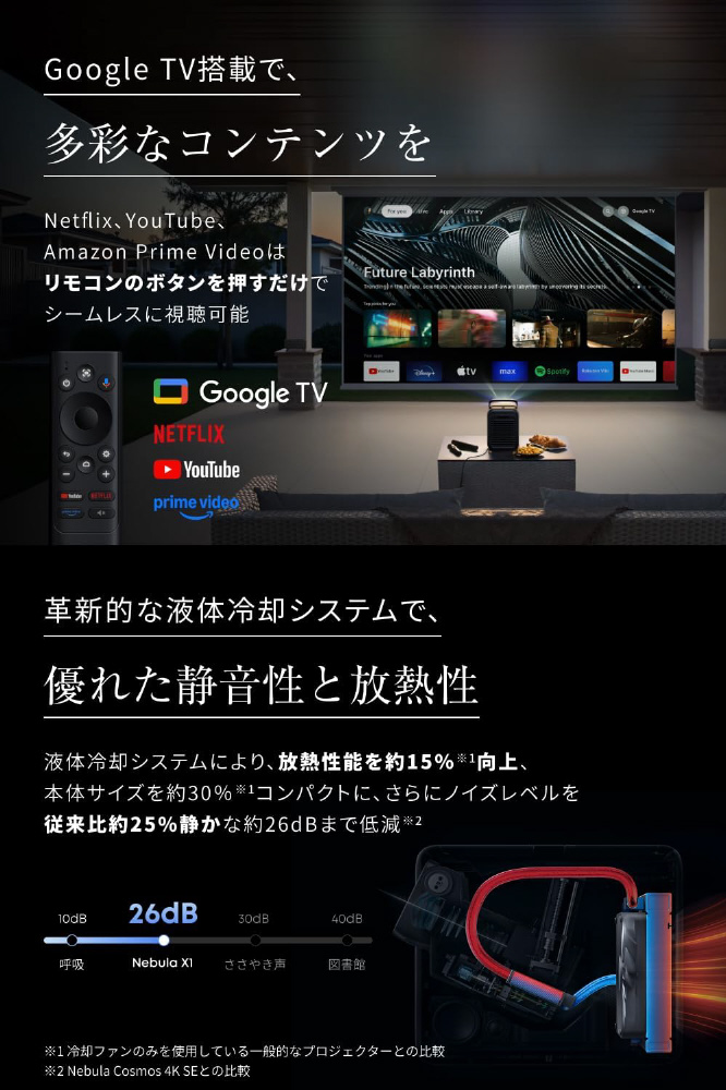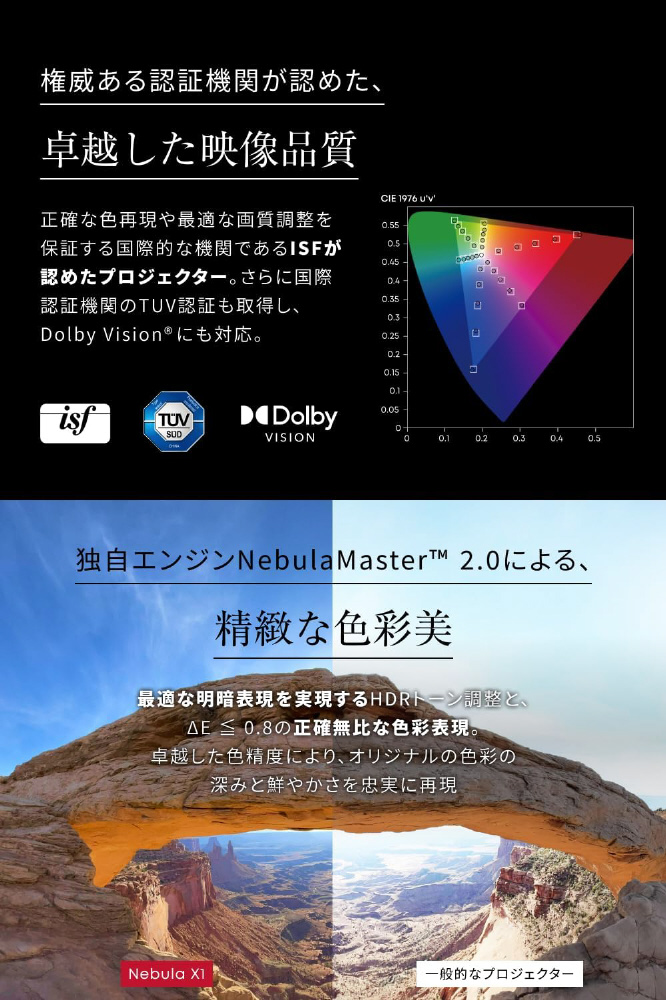 4K 3色レーザーによる、鮮烈な映像美を実現したNebula最高峰のフラッグシップモデル。まさに本物の映画館の臨場感を、?宅で?由に楽しめます。