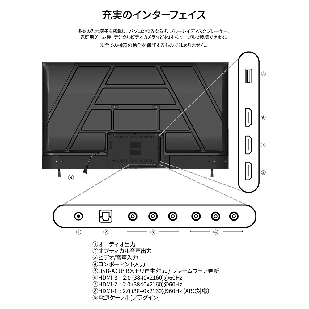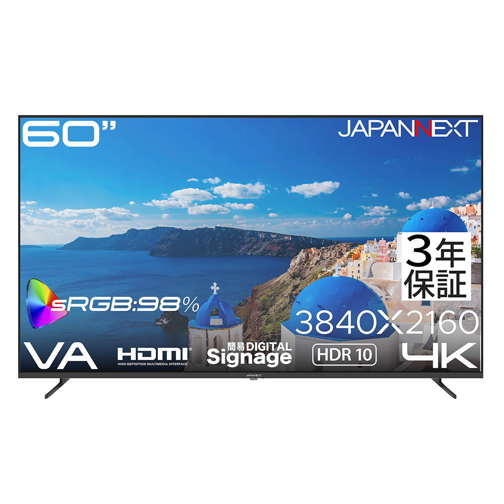 「【3年保証モデル】60インチ VAパネル搭載 4K(3840×2160)解像度 大型液晶モニター HDMI sRGB:98% HDR ビデオ/音声入力 コンポーネント入力 オプティカル音声出力 オーディオ出力 USBメモリ再生対応 リモコン同梱」