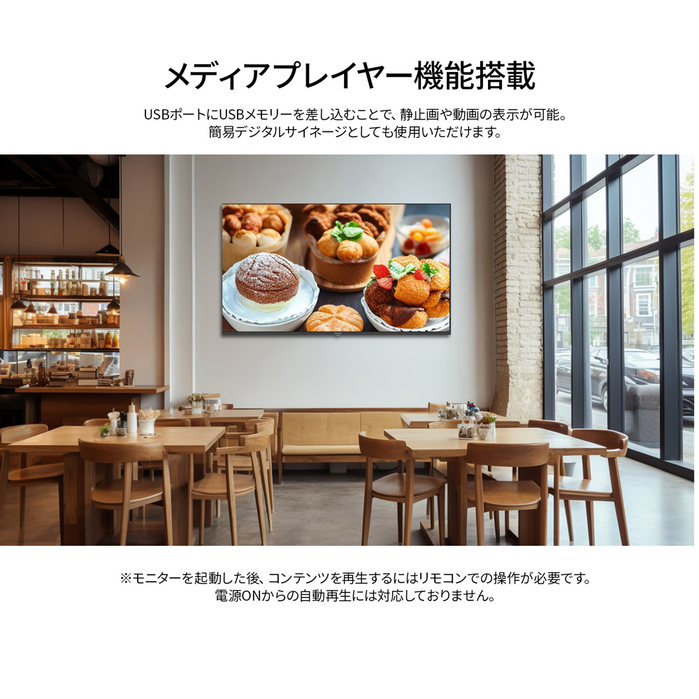 ■USB?ポートを使用して簡易デジタルサイネージとしてもご利用できます(屋内使用のみ)。パソコンなどがなくても、?USB?メモリを差すだけで、簡単に画像や動画を表示できます。