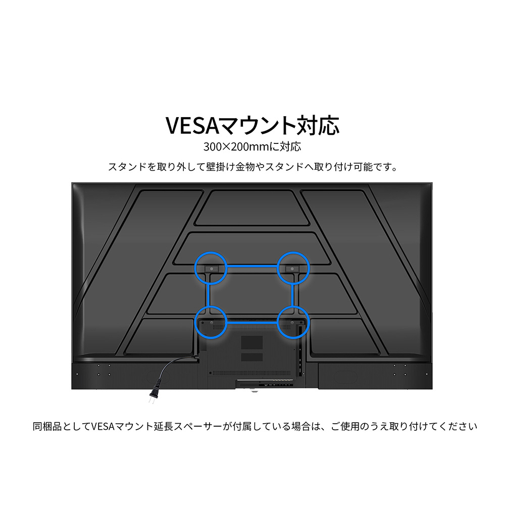 ■300×200mmのVESAマウントに対応しますので、対応の壁掛け金具やスタンドなどに取り付けが可能です。