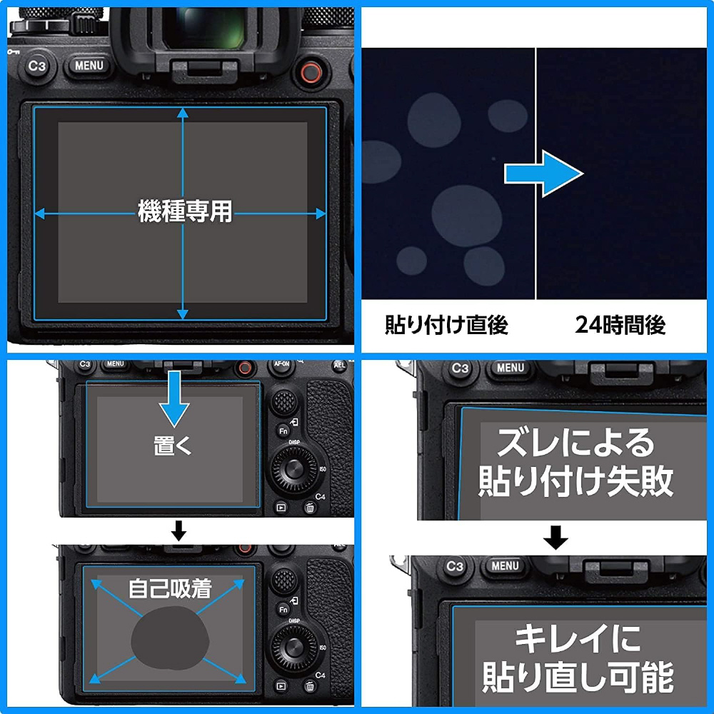 シリコン粘着層の自己吸着性により、フィルムを画面に置くだけで自然に貼り付くため貼り付けが簡単です。