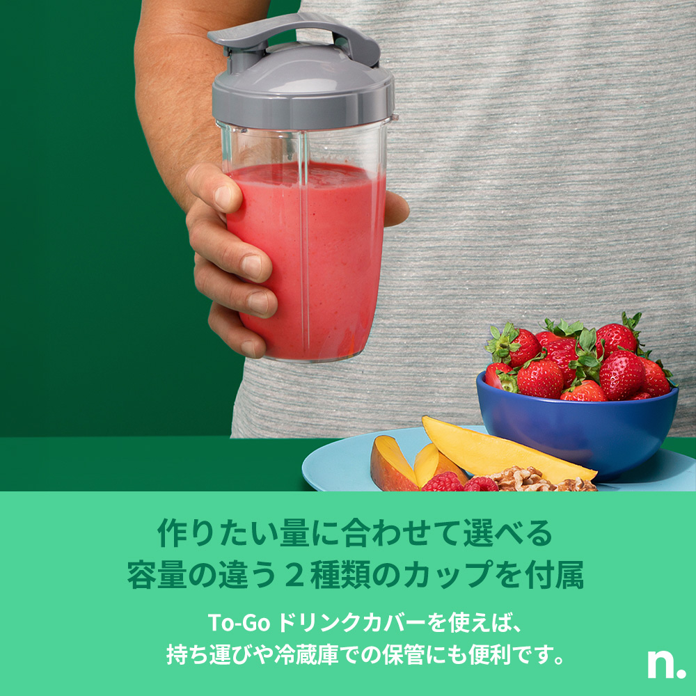 カップに食材を入れて押すだけ。スピーディーにストレスなく使える直感的デザイン。To-Goドリンクカバーに付け替えれば、そのままタンブラーとして持ち運びOK。作ったドリンクはカップのまま冷蔵庫で保存もできます。