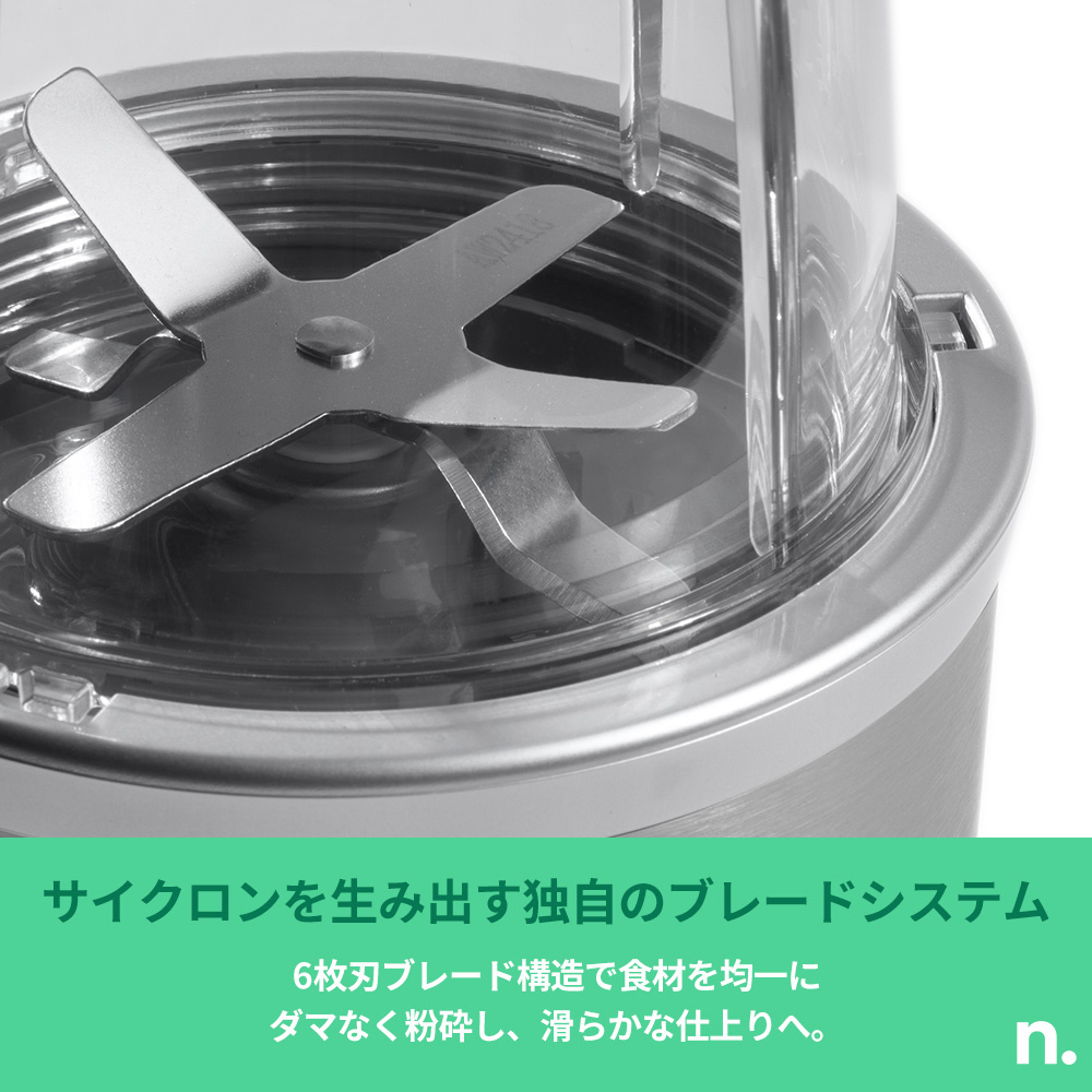 独自のサイクロンを生み出すブレードシステムが食材を均一にダマなく粉砕し、より滑らかな口当たりに。