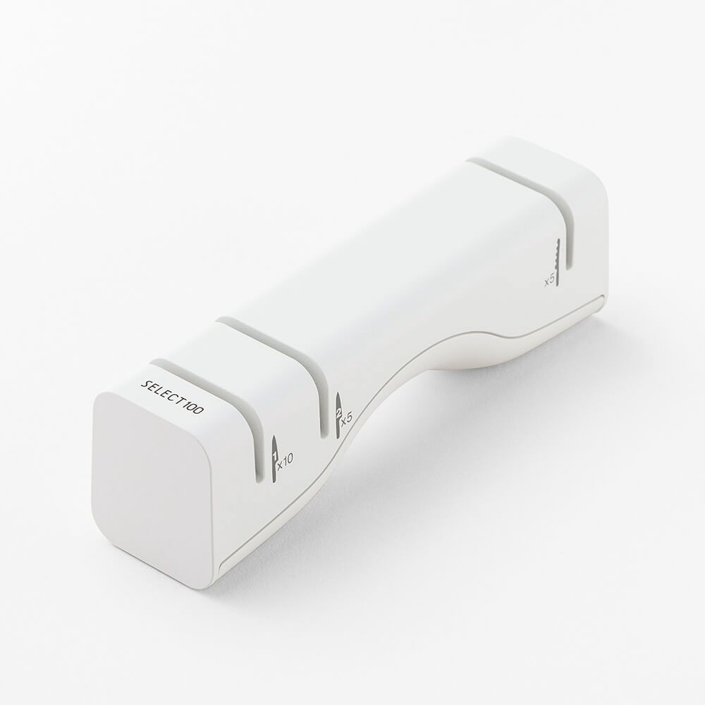 使いやすい道具はシンプルで美しく、手になじむ、それがセレクト100の考え方。料理のプロたちが厳しくチェックしたうえに考え抜かれたキッチンツールシリーズです。シャープナー(両刃包丁・ブレッドナイフ用)。両刃包丁だけでなく、ブレッドナイフも研ぐことができます。(特許第7399601号)収納しやすいコンパクトな設計で、フック掛け収納も可能。本体に研ぎ回数の目安を表記しています。握りやすい形状で、両利きに対応しています。(特許第7399601号)