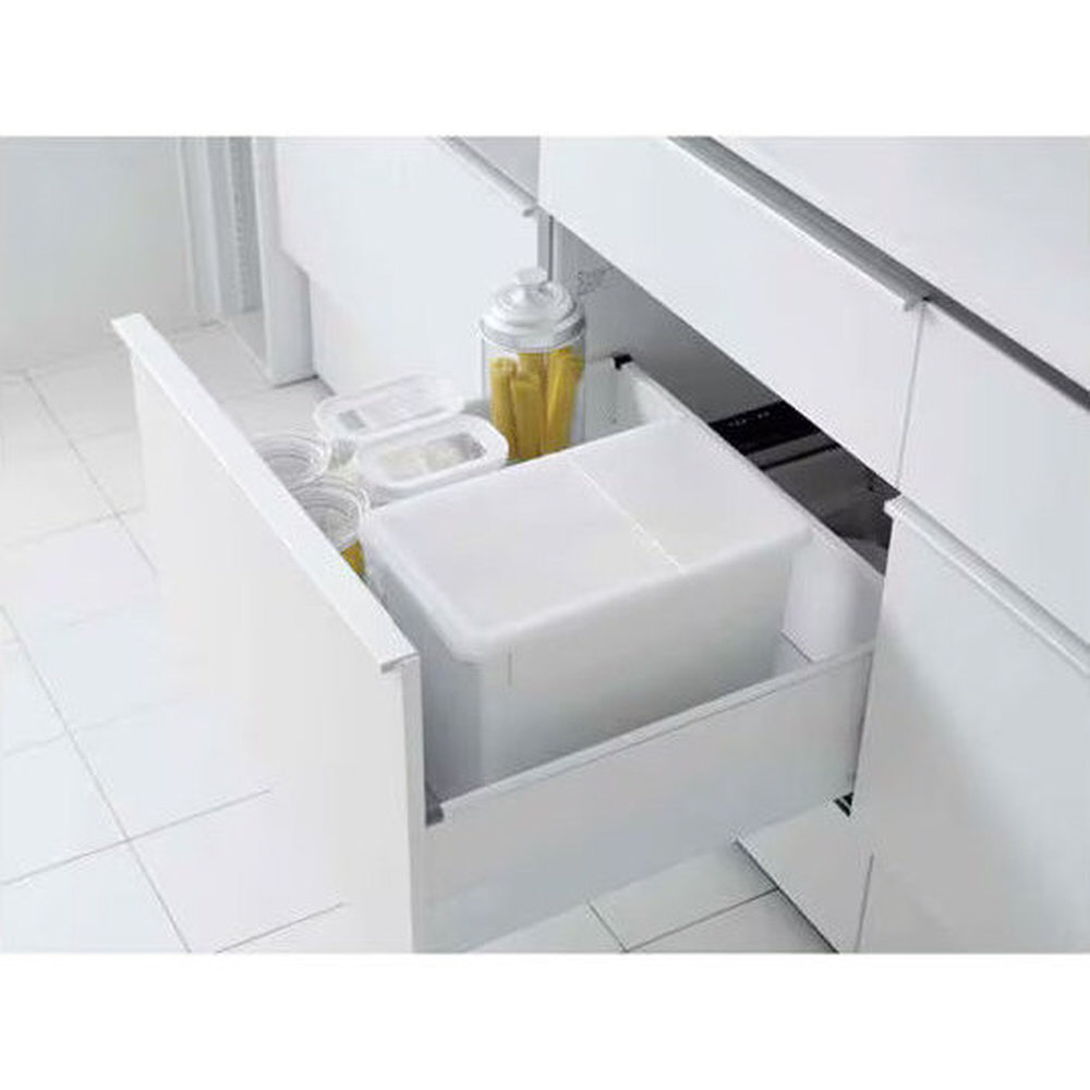 空間に馴染むデザイン。便利な計量カップ付き。シンクしたの引き出しや、冷蔵庫の野菜室にも収まるサイズ感。キャスター付きで楽に引き出せる。丸洗い出来て清潔。