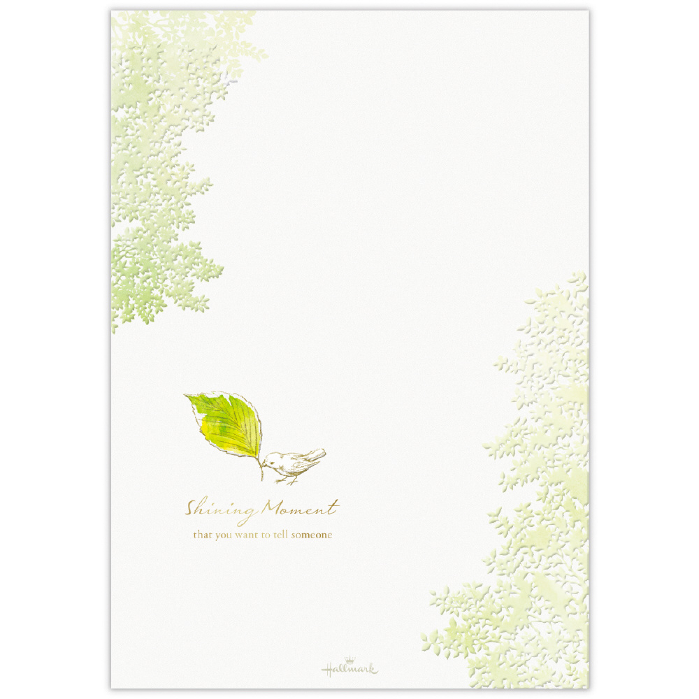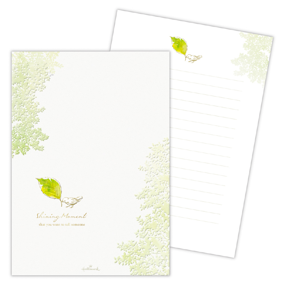 結婚の報告やお世話になった方へのお礼など日常使いとはちょっと違う、かしこまった機会にも、とっておきのお相手へのファンレターにも使えるプレミアムなレターパッドです。みずみずしい木々の中で小鳥が木葉を運んでいる様子を描きました。パールシルクやエンボス加工を施した贅沢な仕上がりをお楽しみいただけます。