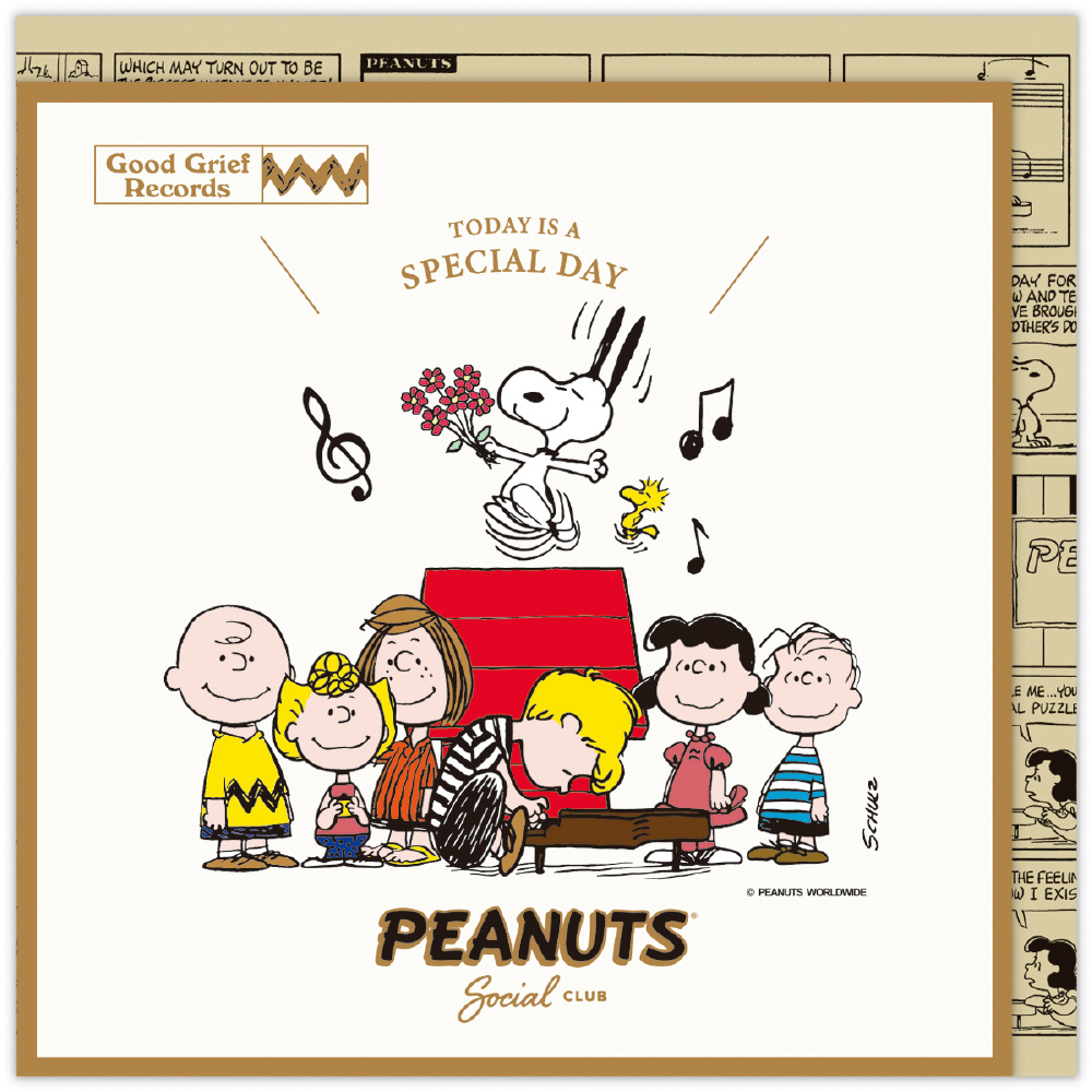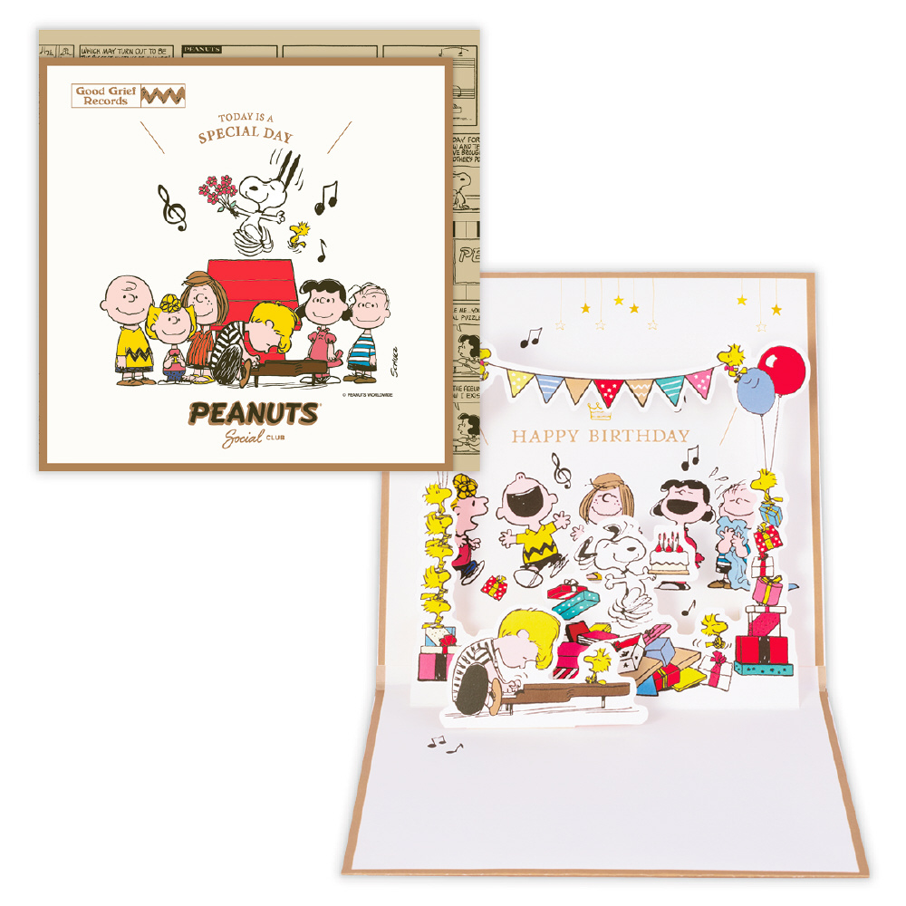 大人っぽいレコードジャケット風のオルゴールカード。PEANUTSのアニメでもお馴染みの名曲『Linus & Lucy』に、スヌーピーの楽しい笑い声をプラス。笑い疲れた後の「はぁ…」が、スヌーピーらしさを引き立てます。