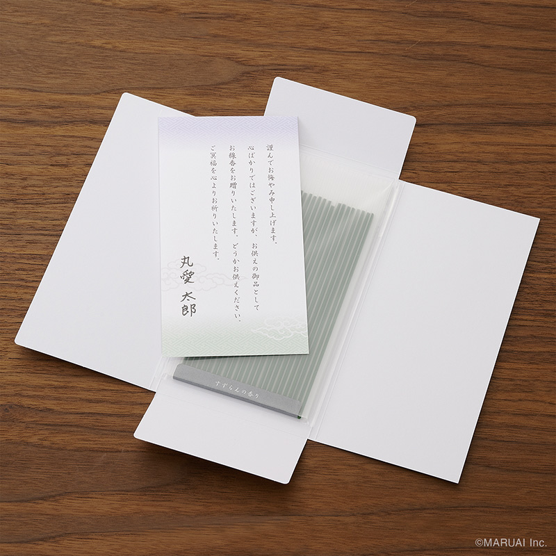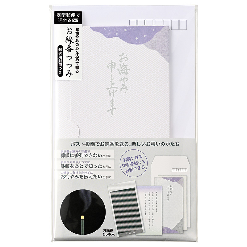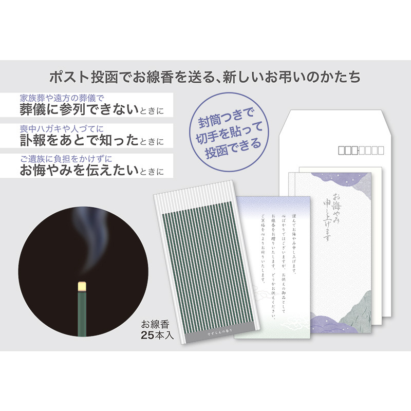 お線香をポスト投函で送ってお悔やみの気持ちを伝える、新しいお弔いのかたちの線香付きお悔やみ袋です。お線香はすずらんの香りで、煙の少ない微煙タイプ 25本入。