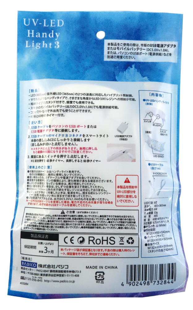 内容物:UV-LEDハンディライト3(本体)、USBケーブル(長さ1m)