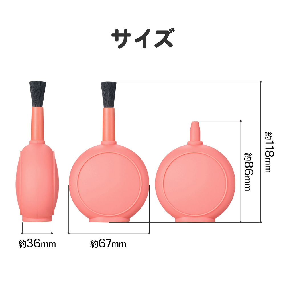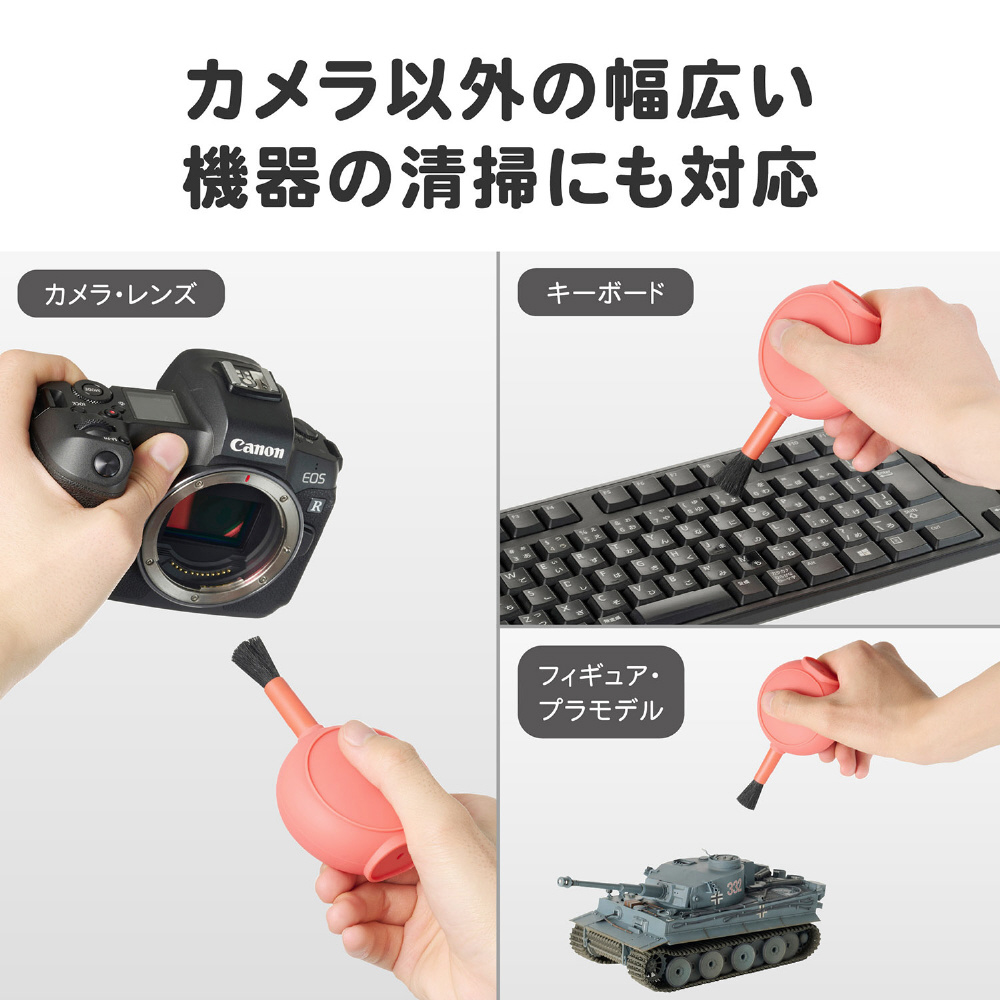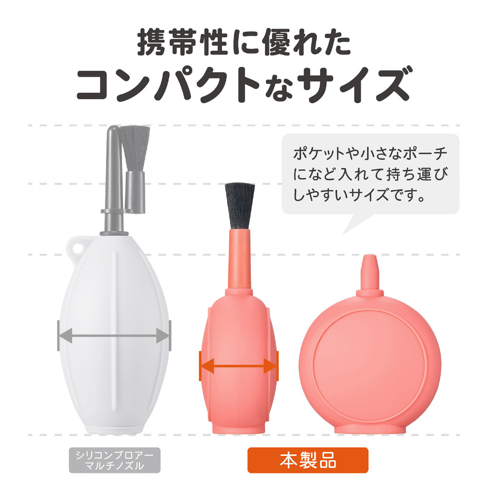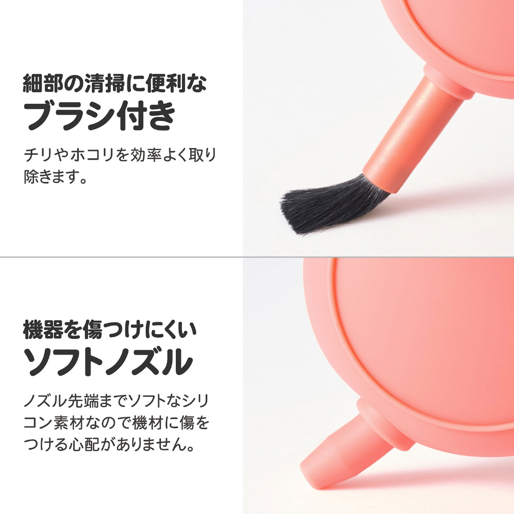 ブラシが付属しており、シーンに応じてブローとブラッシングを使い分けた清掃が行えます。限られたスペースを有効に活用できる、携帯性に優れたメンテナンスアイテムです。