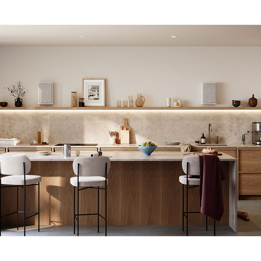 SONIK ON-WALLは、あなたのライフスタイルに無理なくフィットするように設計されています。スリムでスタイリッシュなデザインと4つの美しい仕上げにより、ミニマルな空間からクラシックなインテリアまで、あらゆる部屋に調和します。縦向きにも横向きにも配置できるため、設置の選択肢が広がります。