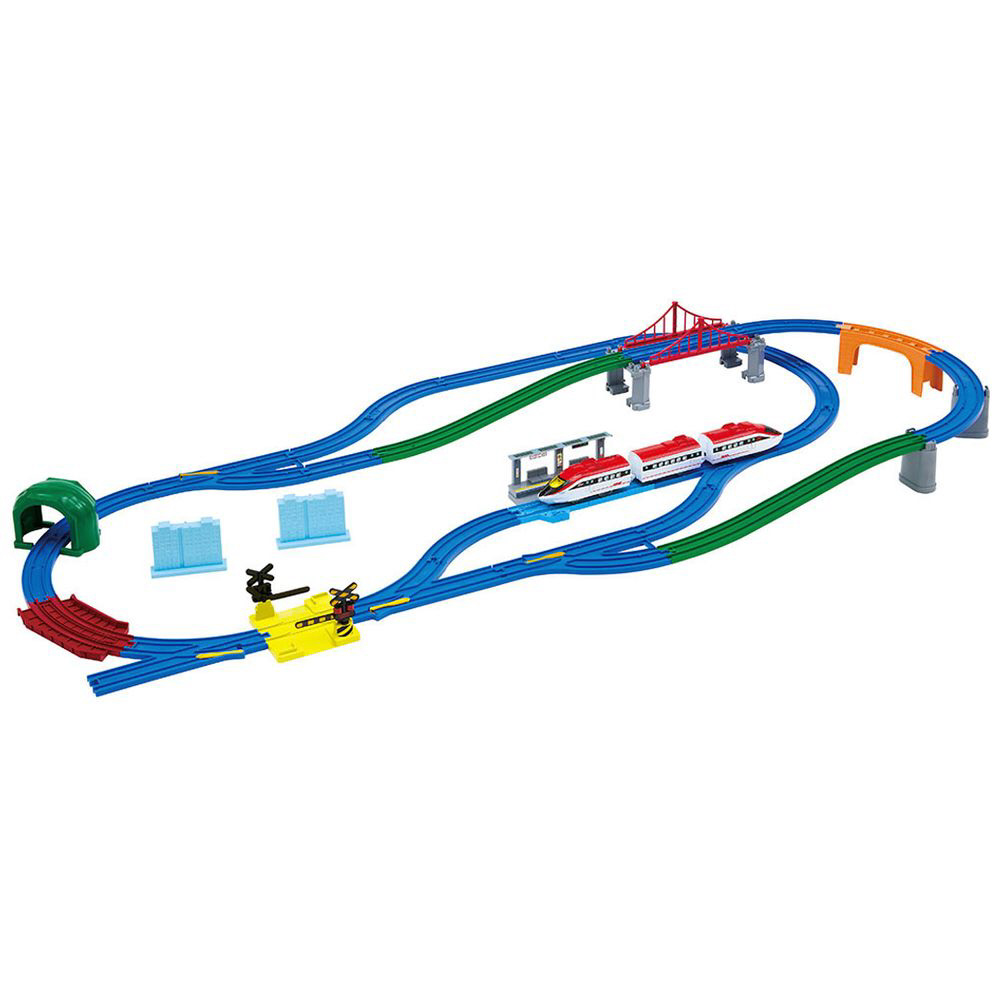 「駅」「踏切」「つり橋」「曲線ガーター橋」「トンネル」まで入った、すぐに遊べるオールインワンセットです。