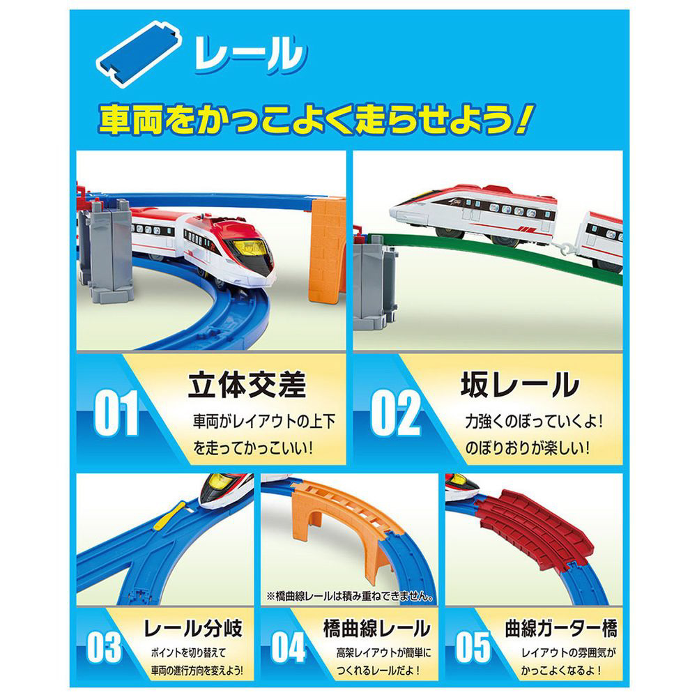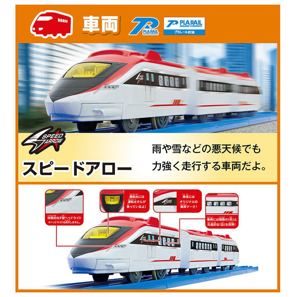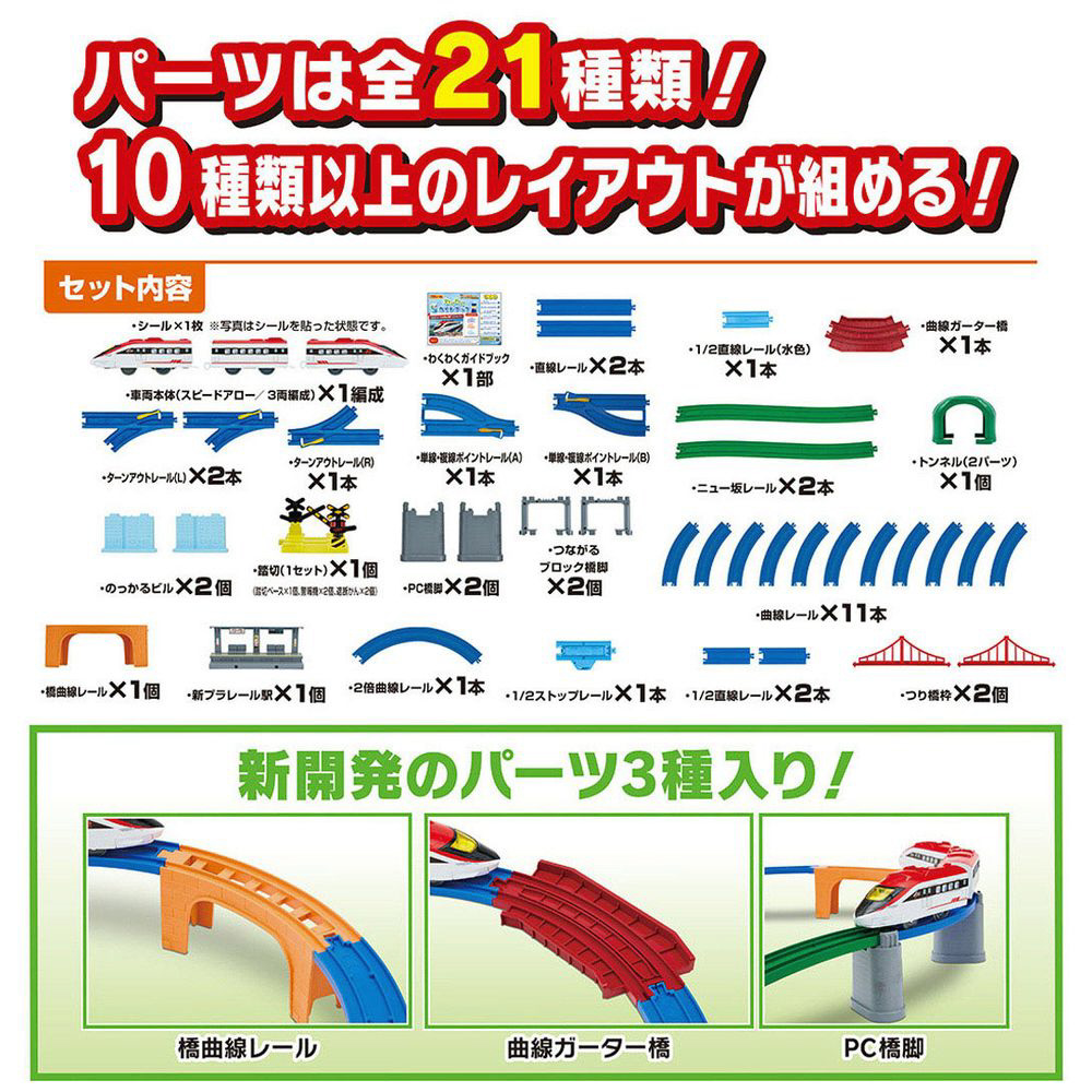 オリジナル新車両「スピードアロー」や、高架が簡単に作れる「橋曲線レール」「PC橋脚」をはじめ、