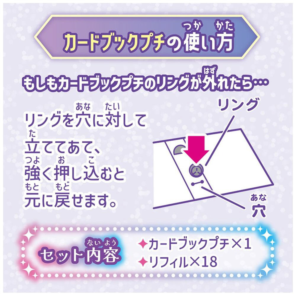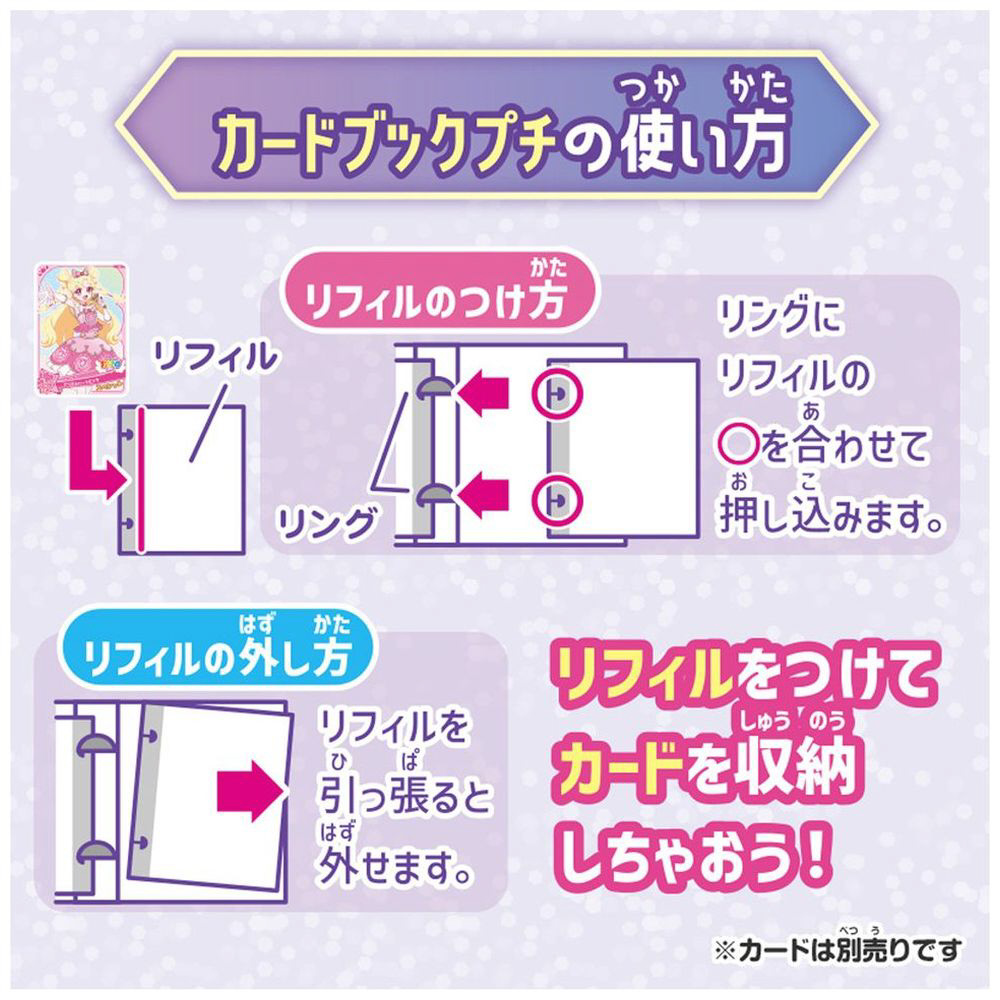 キラキラがかわいい、カード収納アイテム。持ち運びに便利なサイズで、リフィルはワンタッチで簡単に付け外しが可能!