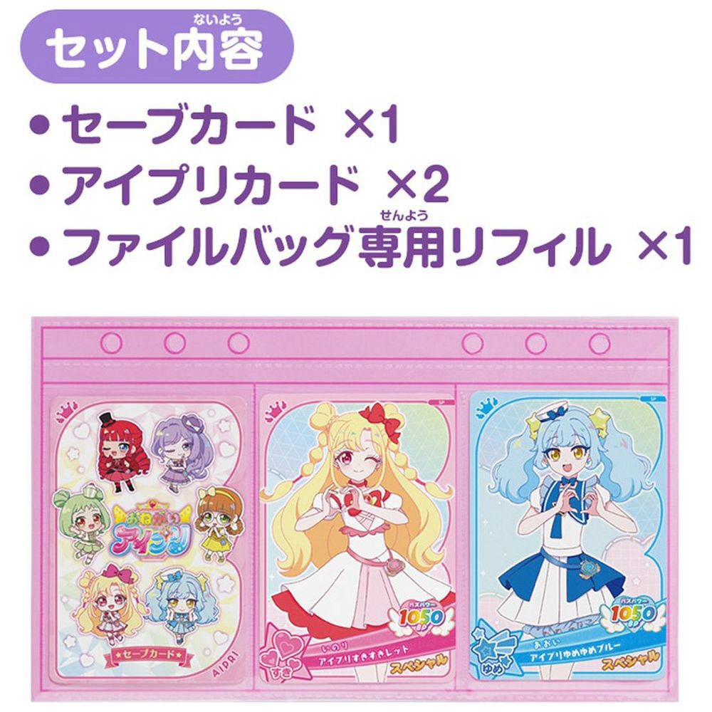 アイプリデビューにピッタリ♪スペシャルなアイプリカード2枚とアミューズメントゲームで遊んだデータを記録できるセーブカード1枚、別売のファイルバッグに使えるリフィルが入ったカードセット。