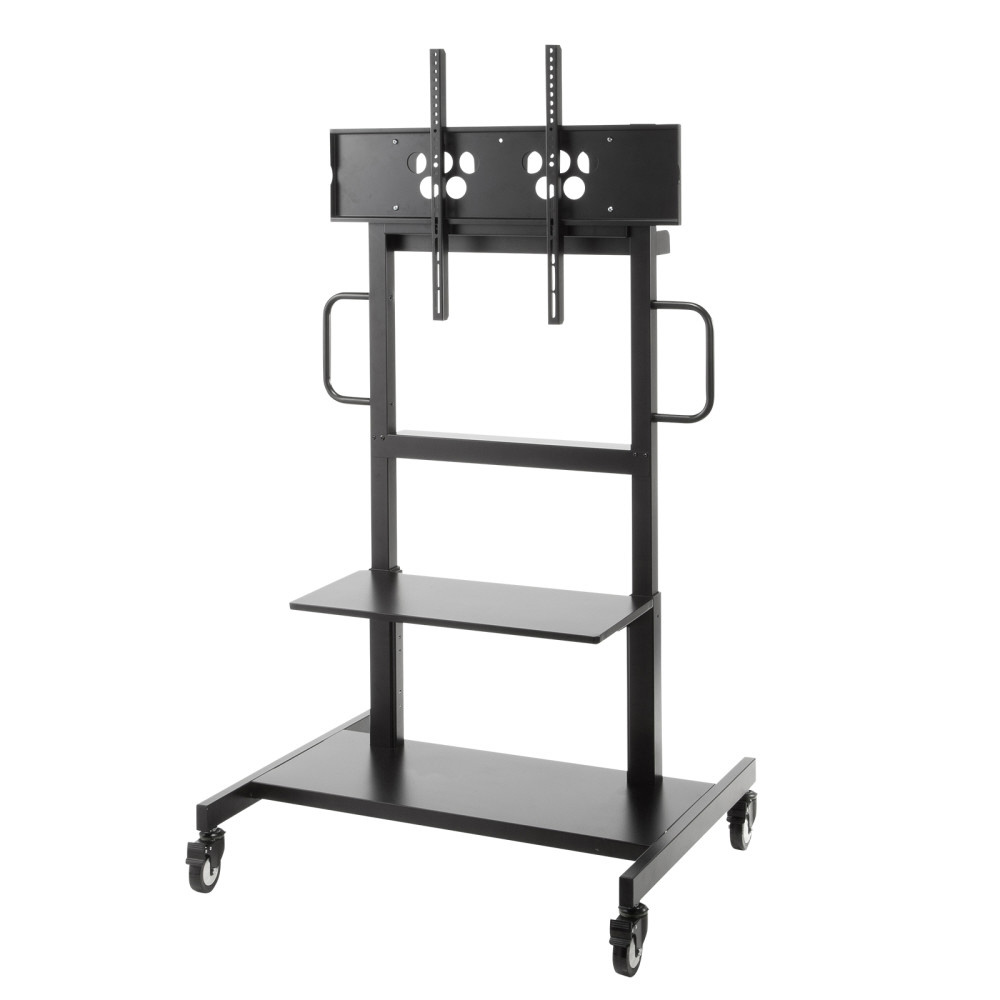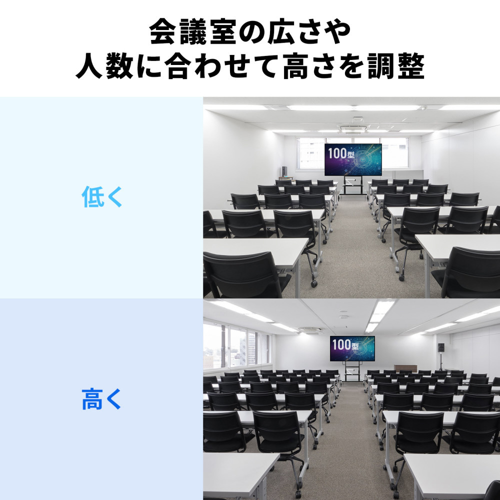 総耐荷重110kg。100型ディスプレイ対応・転倒角前後左右15度以上の手動上下昇降式ディスプレイスタンド。