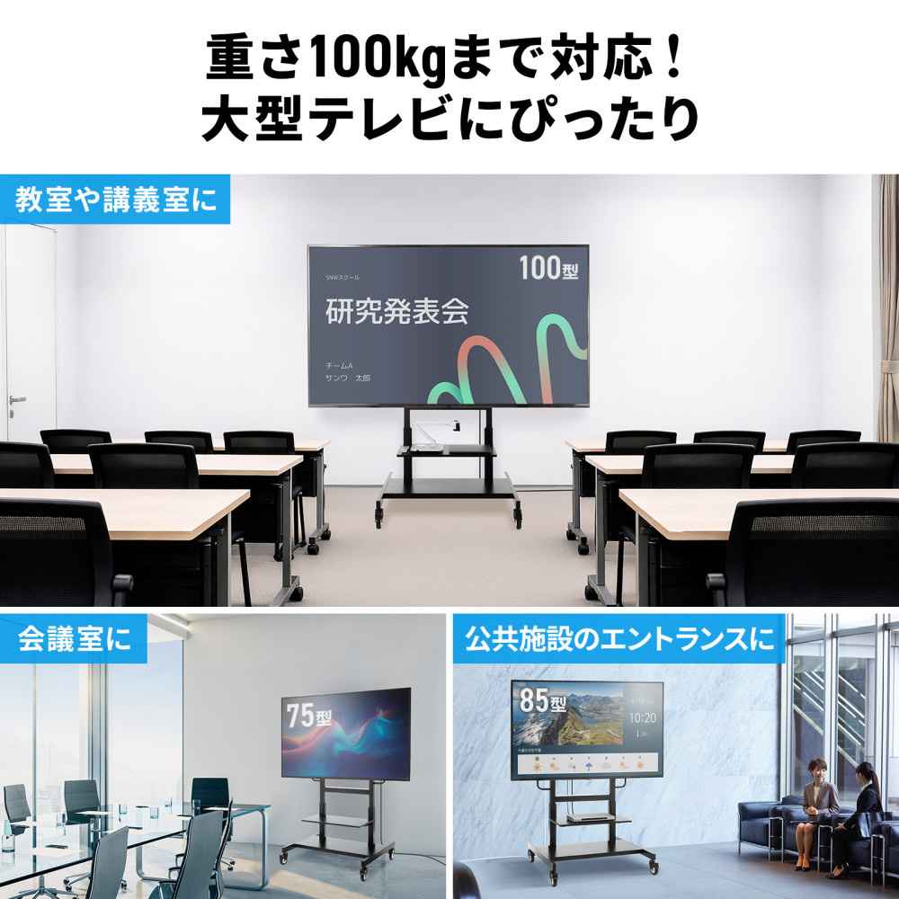 ●60〜100インチまでの大型ディスプレイに対応し、多様なモニター設置に対応できます。