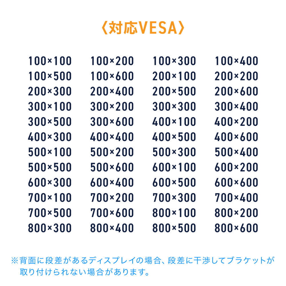●対応VESA規格100x100,100x200,100x300,100x400,100x500,100x600,200x100,200x200,200x300,200x400,200x500,200x600,300x100,300x200,300x300,300x400,300x500,300x600,400x100,400x200,400x300,400x400,400x500,400x600,500x100,500x200,500x300,500x400,500x500,500x600,600x100,600x200,600x300,600x400,600x500,600x600,700x100,700x200,700x300,700x400,700x500,700x600,800x100,800x200,800x300,800x400,800x500,800x600に対応しています。