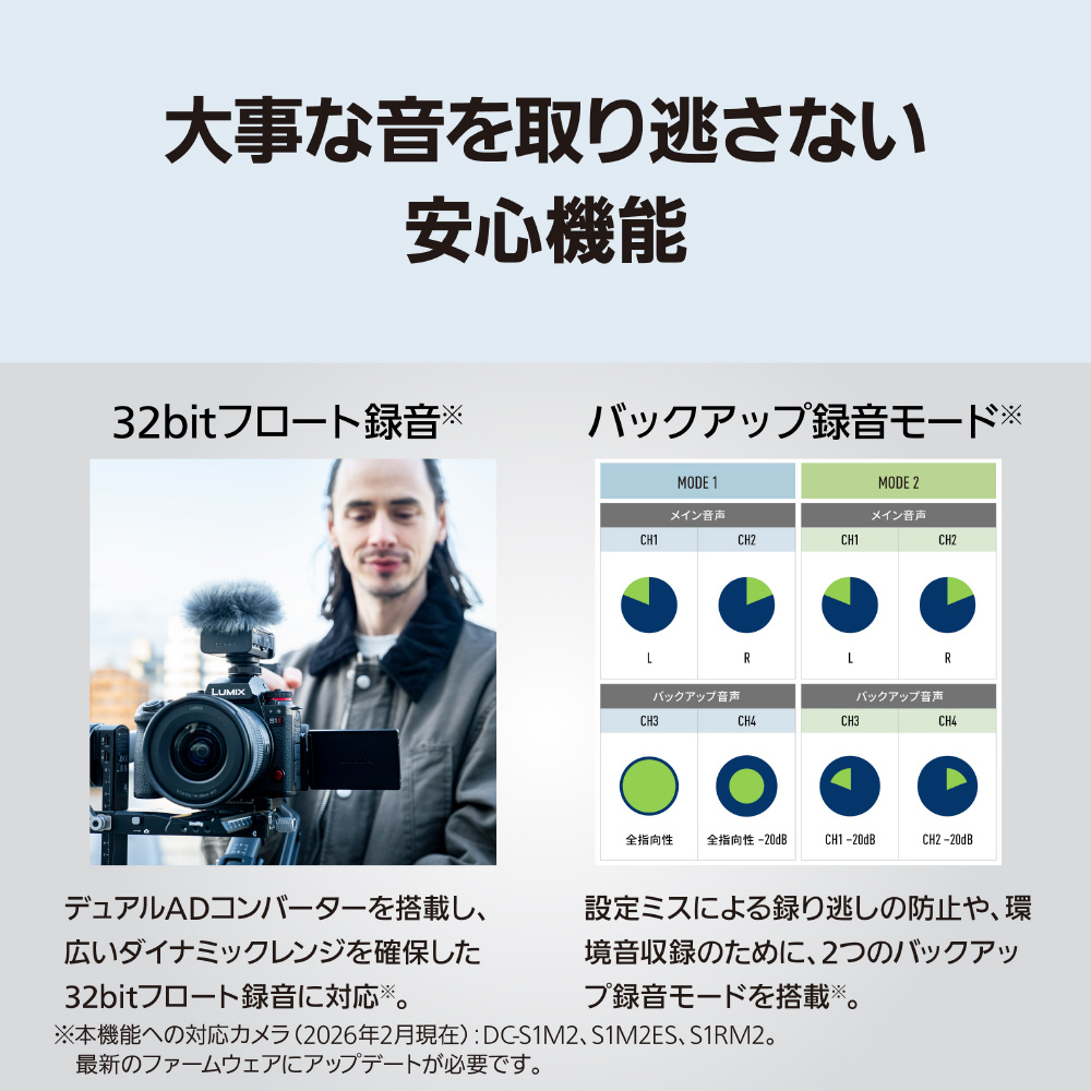 「ダイレクトボタン」による直感的な操作で、録音モードを切替えが可能。撮影時の音声録音レベル調整が不要な「32bitフロート録音」や、録り逃さない「2つのバックアップ録音モード」により、予期せぬ収録ミスもサポートします。