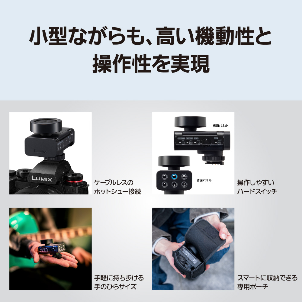 手のひらサイズのコンパクトさ、ケーブルレスでカメラとの一体感、機動力を実現