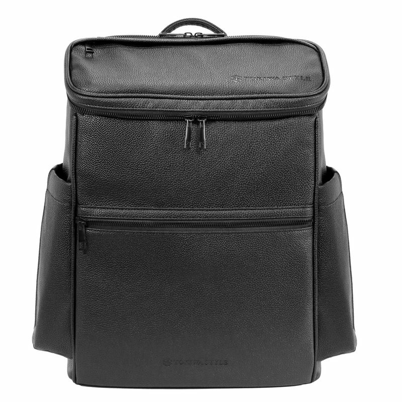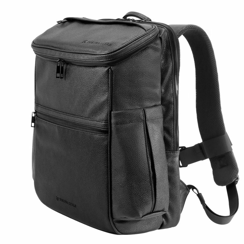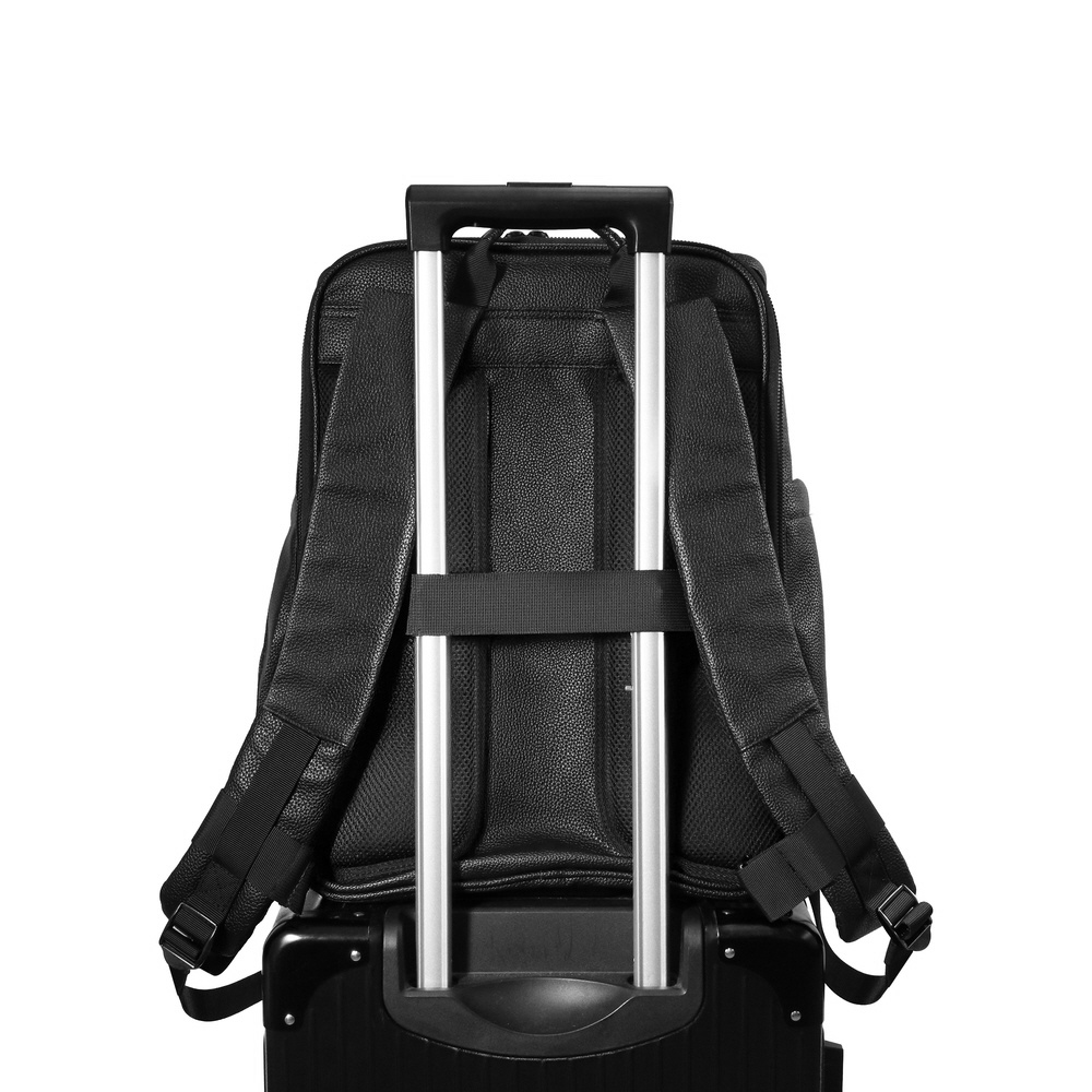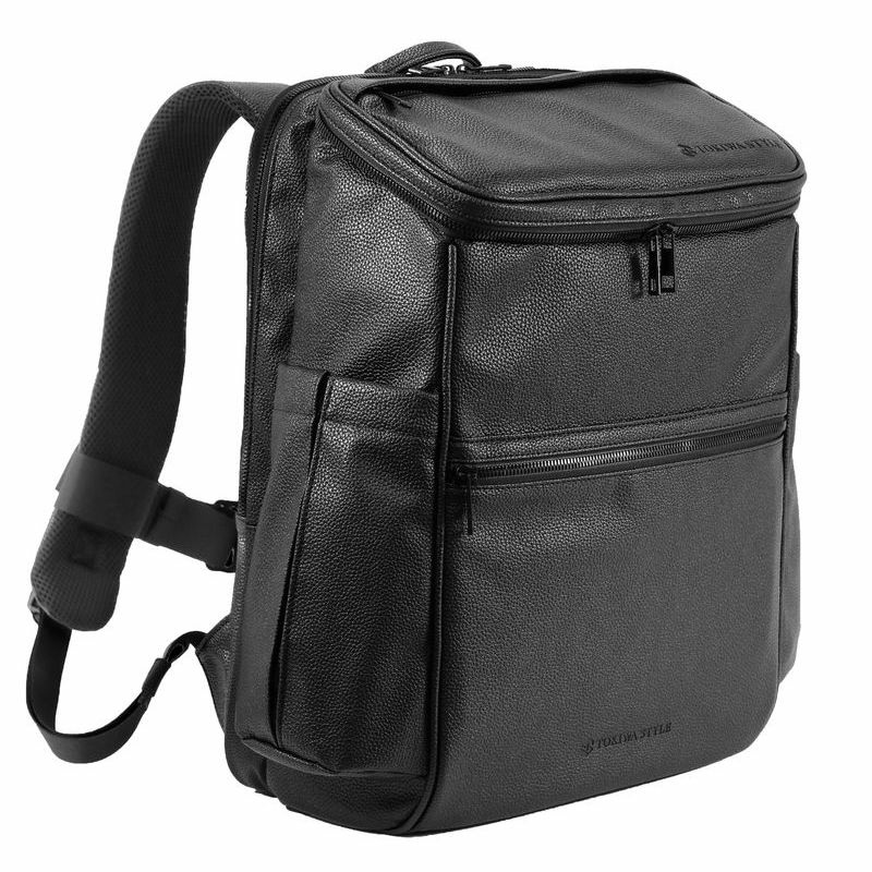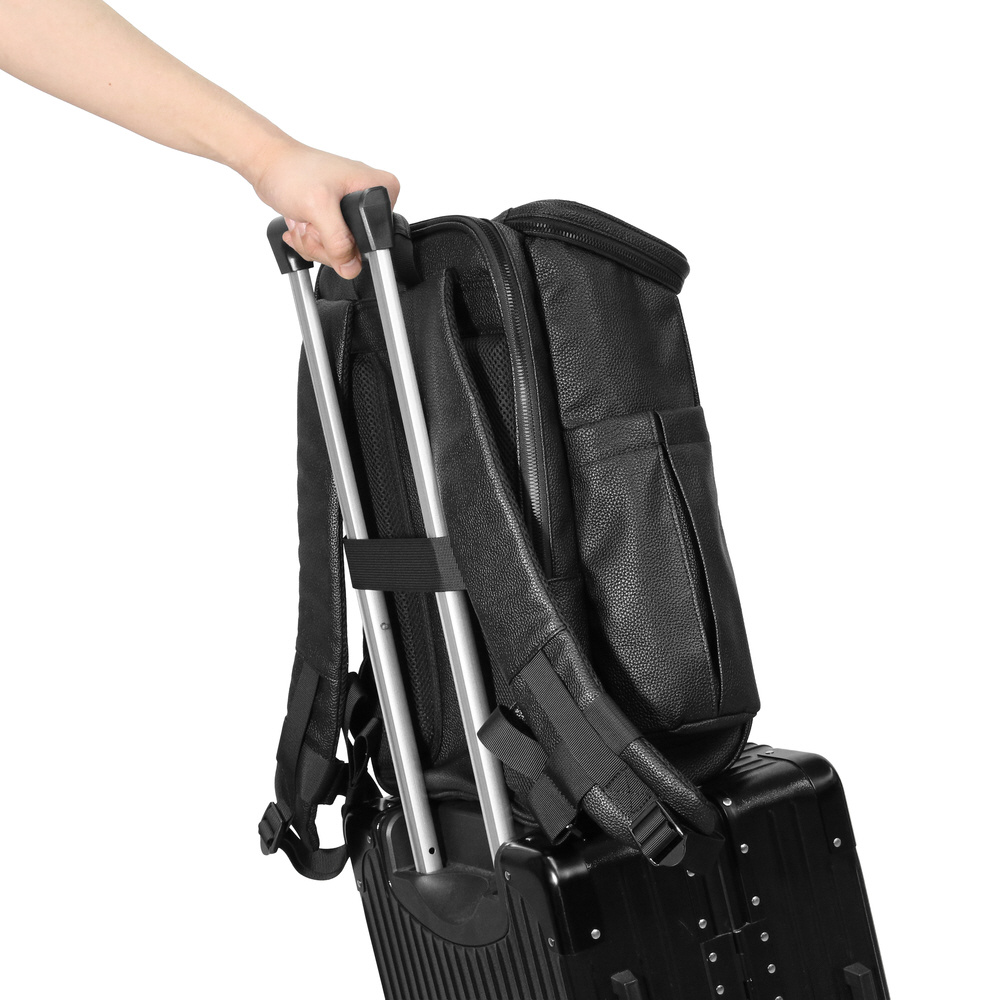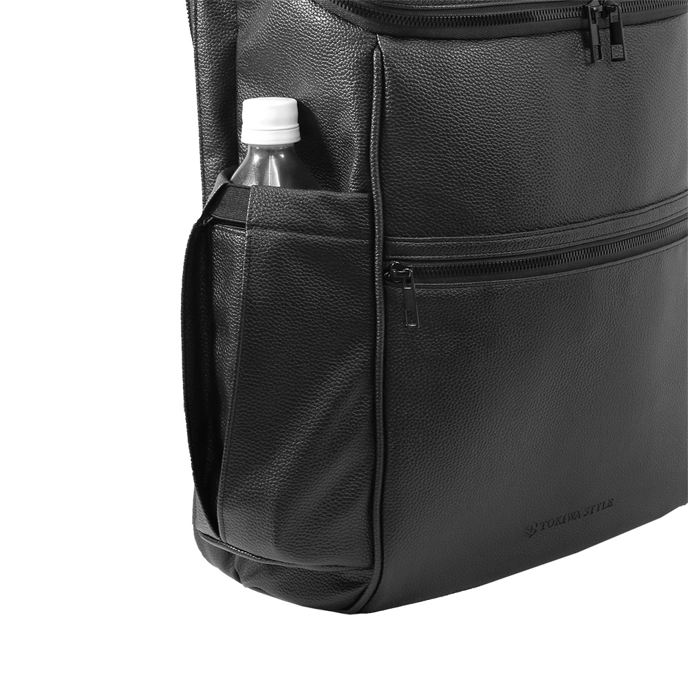 高級感のあるシボ革調素材を採用し、タウンユースにも馴染む落ち着いた佇まいに仕上げた、軽量設計のPVCレザー リュックです。