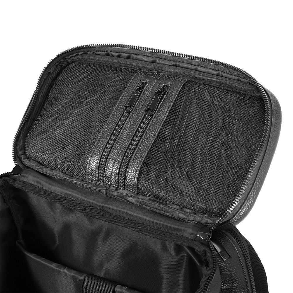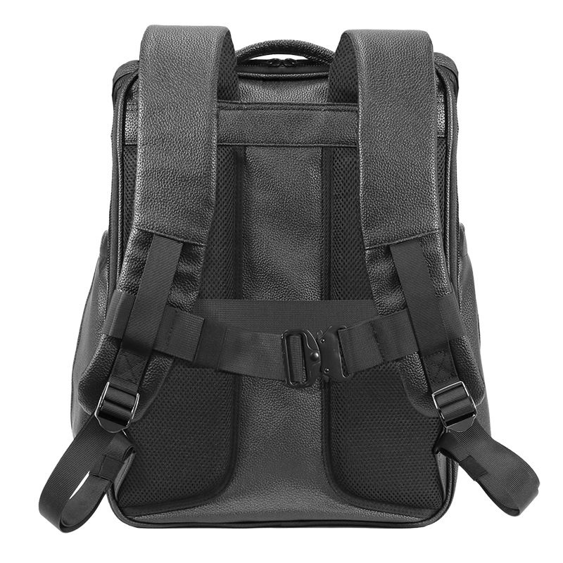 「RK18 PVCレザー リュック」は高級感のあるシボ革調素材を採用し、タウンユースにも馴染む落ち着いた佇まいに仕上げました。軽量設計により、長時間の移動でも負担を軽減します。使い勝手の良いサイドポケットを左右に配置し、内部にはバッテリーやメディア類を整理しやすい細かな収納スペースを配置。金具にもこだわり、移動時の安定性を高めるチェストベルトを装備し、快適な背負い心地をサポートします。