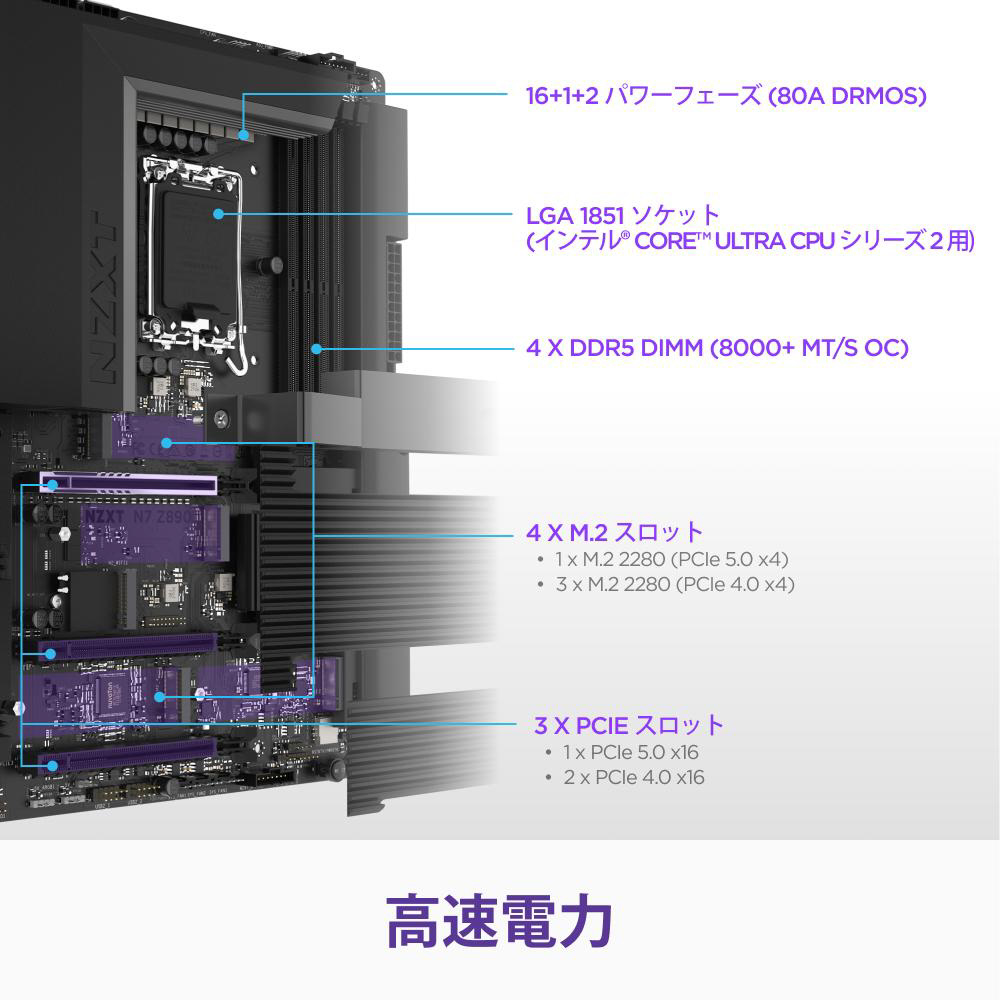 NZXT N7 Z890は、最新のIntel Core Ultra プロセッサ(シリーズ2)に対応した、機能美あふれるATXマザーボードです。
