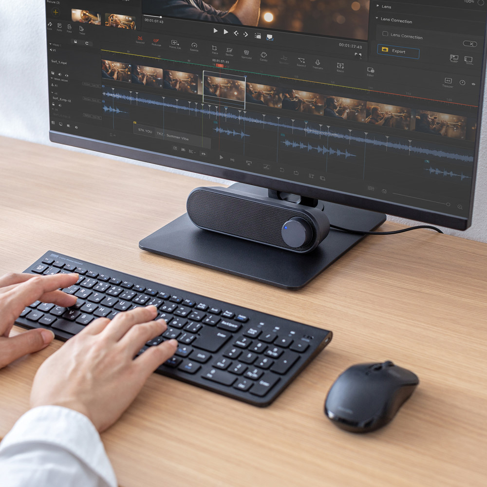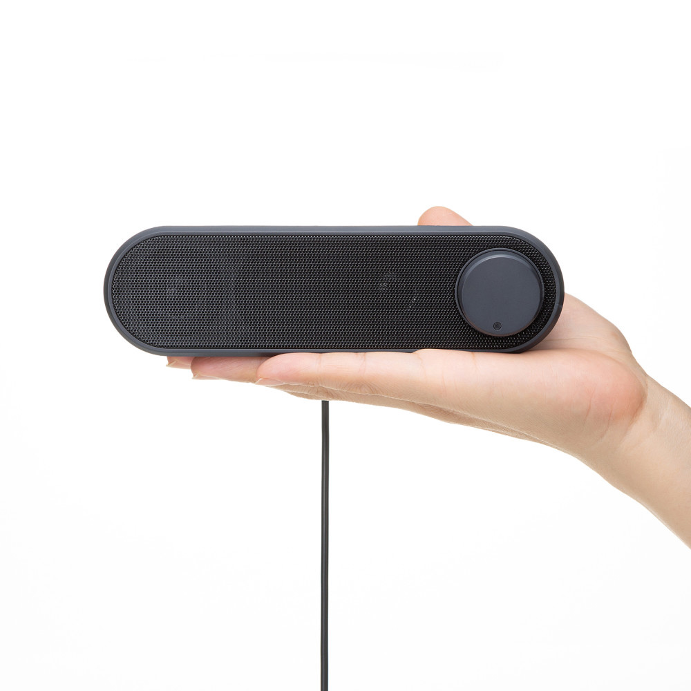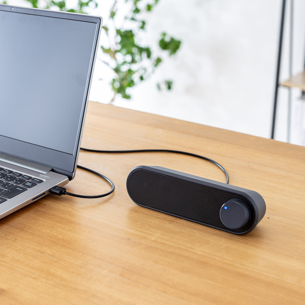 USBケーブル1本で接続可能な最大6W(3W+3W)ステレオ出力のUSBスピーカー。USB A・Type-C両対応。横置きスリム設計と約2mロングケーブルで省スペース設置を実現する小型軽量モデル。