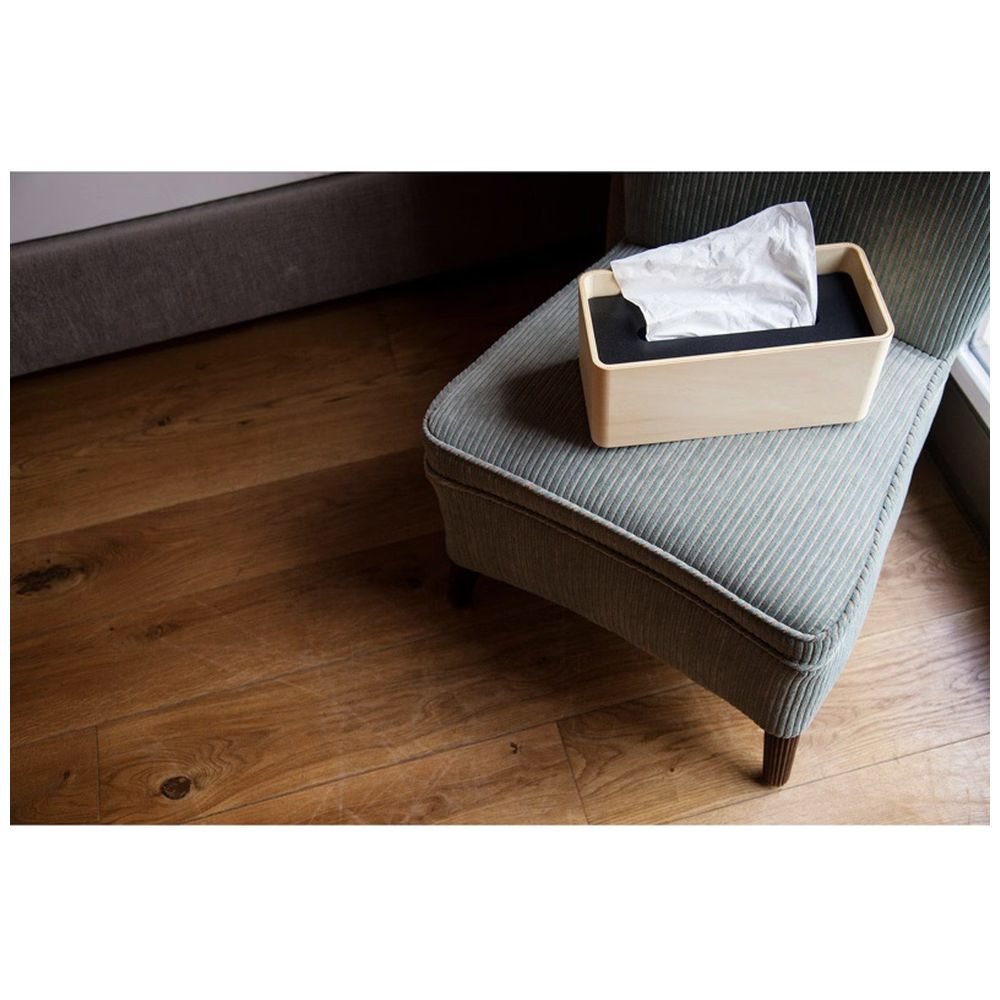 1枚のプライウッドをぐるりとラウンドさせたティッシュケース。コンパクトサイズのティッシュを2個まで収納出来るといった、実用的な工夫ゆえのカタチです。なによりもそのシンプルで寡黙なミニマルデザインが魅力です。