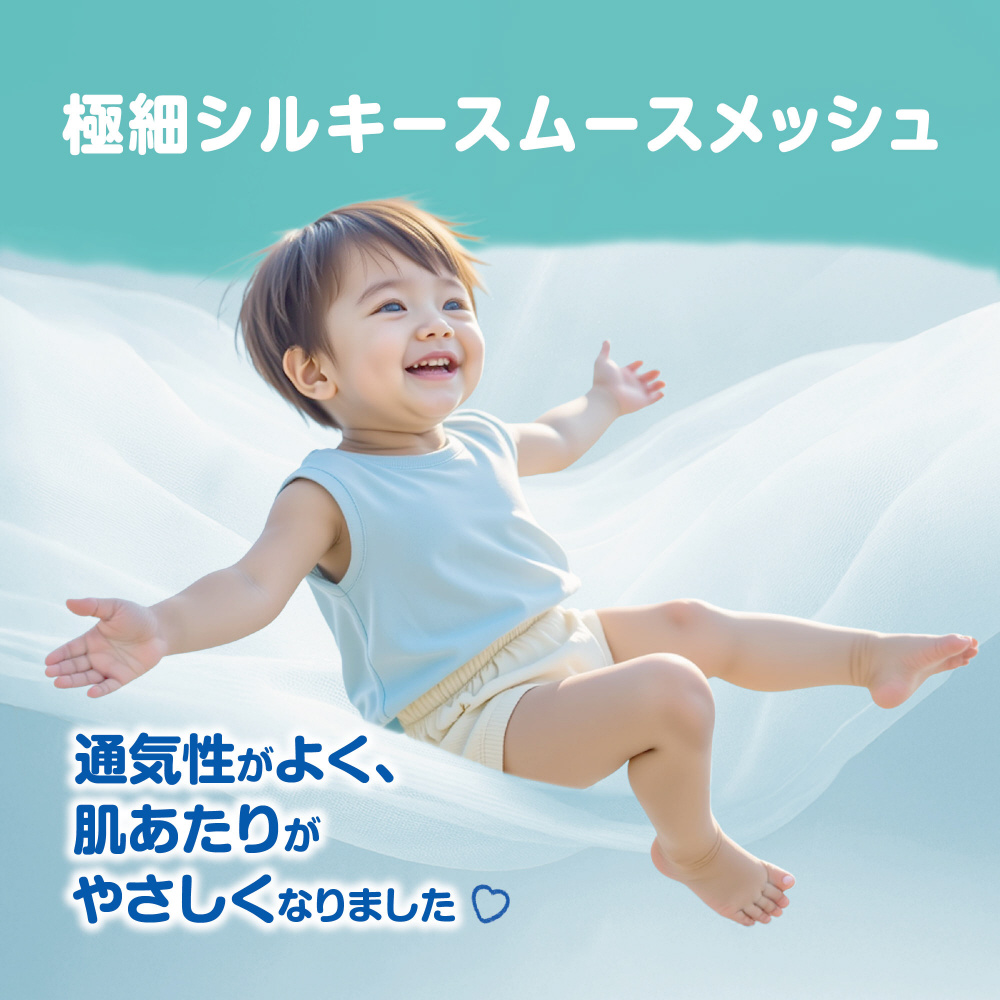 なめらかに肌をすべるようなやさしい肌ざわり。独自! Sカーブフィット独自!1秒吸収*2シート12時間の吸収力2.5倍*3 伸びるのびのびベルト*足回り・腰回りにおいて。