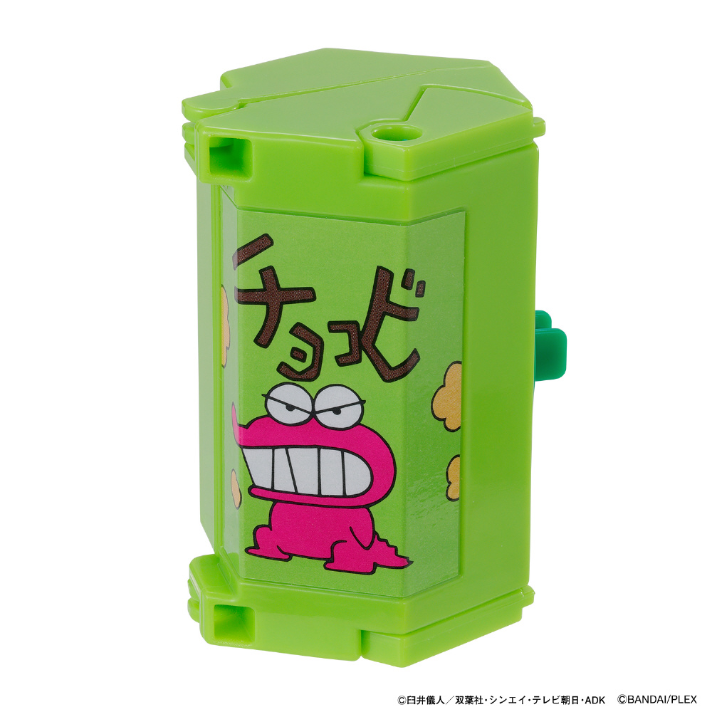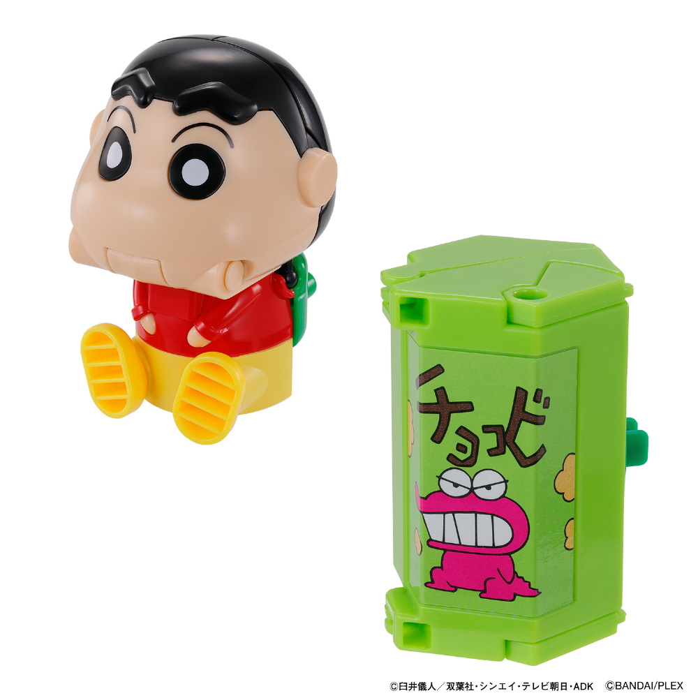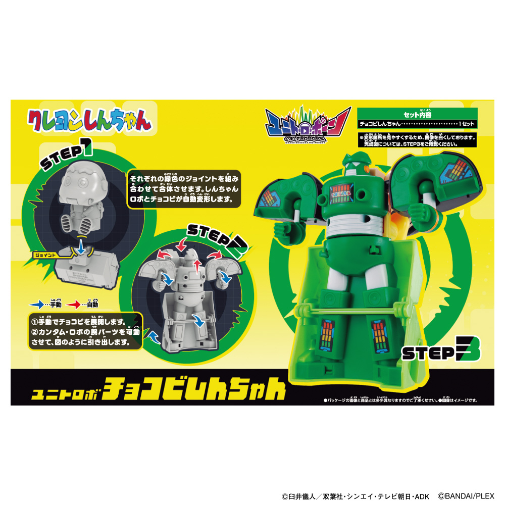 「しんちゃん」モチーフのロボと「チョコビ」が合体し、瞬間変形するユニトロボです。