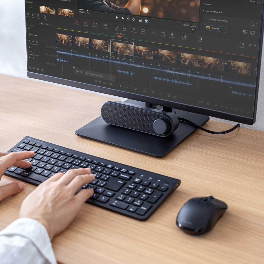 ■横置き型のスリムデザインで、モニター前やデスク下にすっきり設置できます。