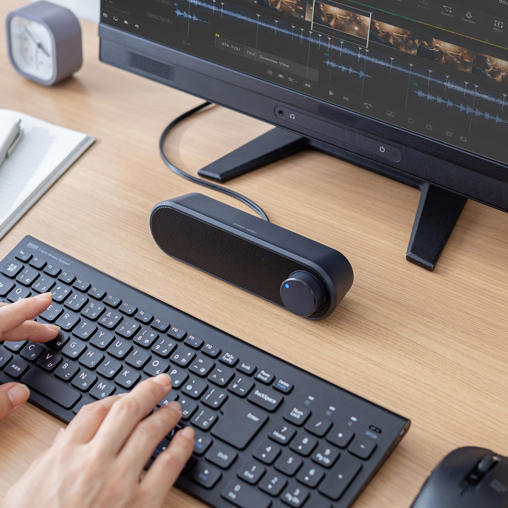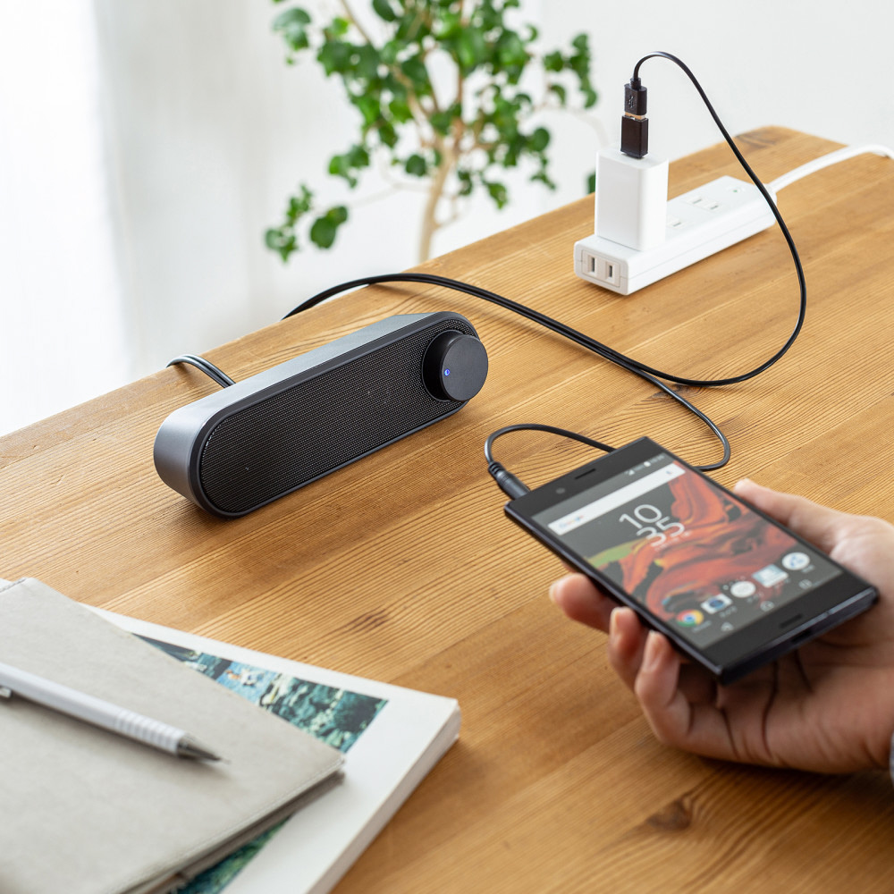 横置きタイプの省スペースなUSB電源スピーカー。デスク上でも邪魔にならずすっきり設置可能。3.5mmステレオミニプラグ接続。