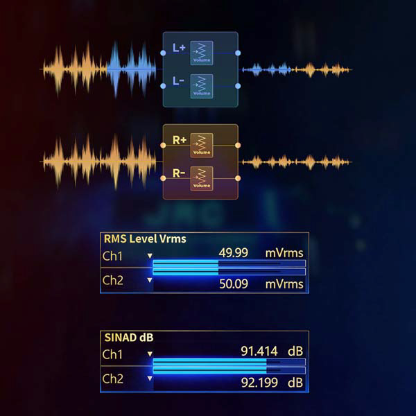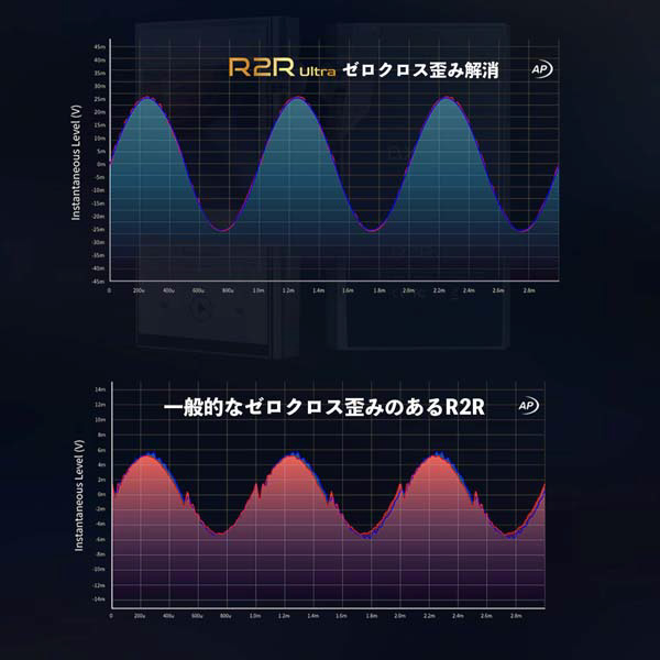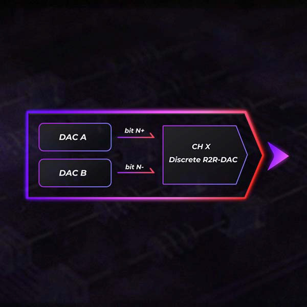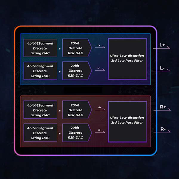 20bit R2R + 4bitストリングDACのハイブリッドR2Rアーキテクチャを採用し、フルバランス8ch完全差動回路、FPGA Master3.0テクノロジーとハードウェア抵抗補償ネットワークを組み合わせています。