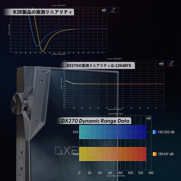 従来のシングルエンド2ch R2Rに対し、DX270は8ch全差動アーキテクチャを採用し、合計8つの差動回路が同期され動作します。