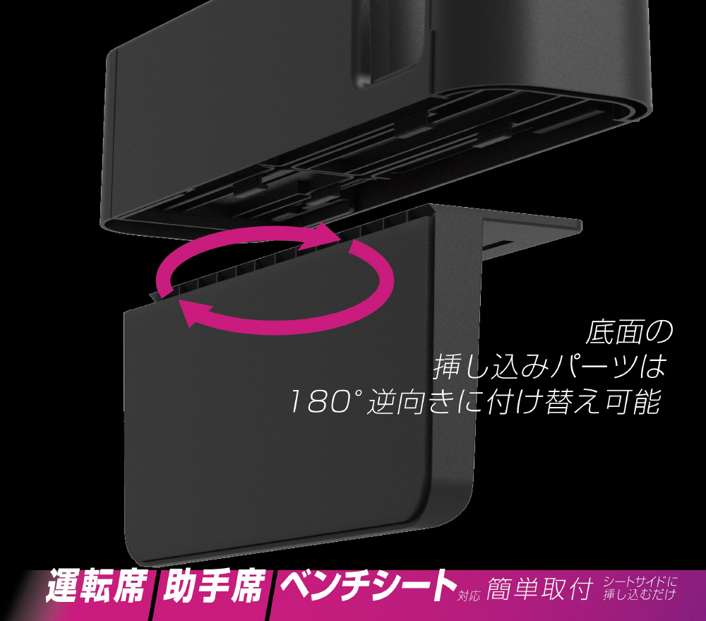 ■底面の挿し込み用パーツを取り外して、逆向きにも付け替えることで、運転席/助手席/ベンチシートにも取り付け可能。