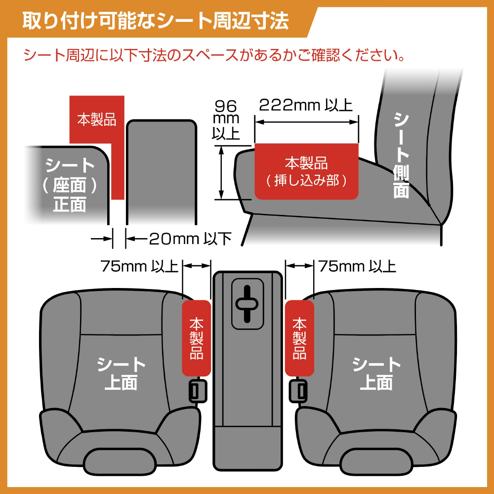 ■シート横に収納ポケットとドリンクホルダーを増設。シートサイドの隙間に挿し込むだけの簡単取り付け。