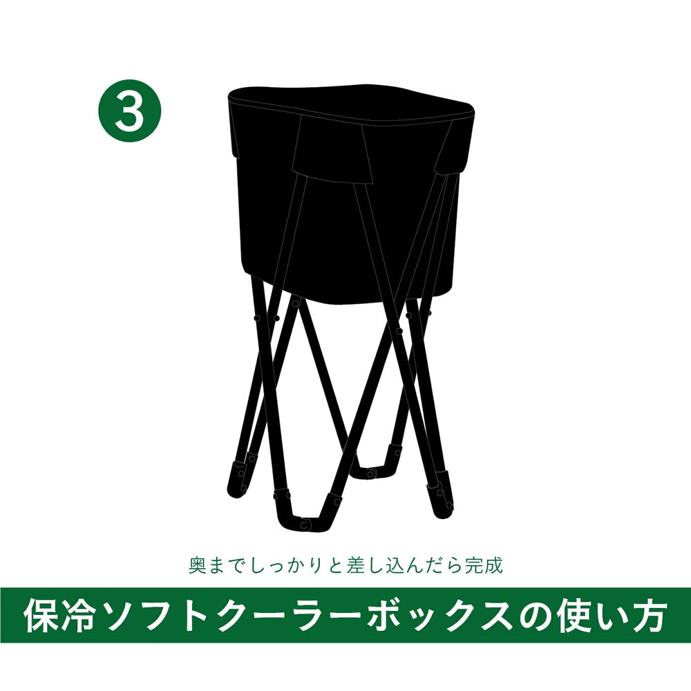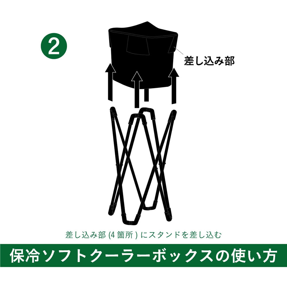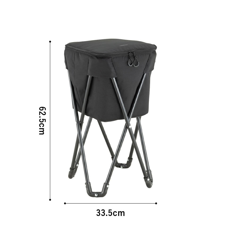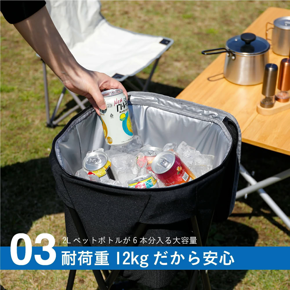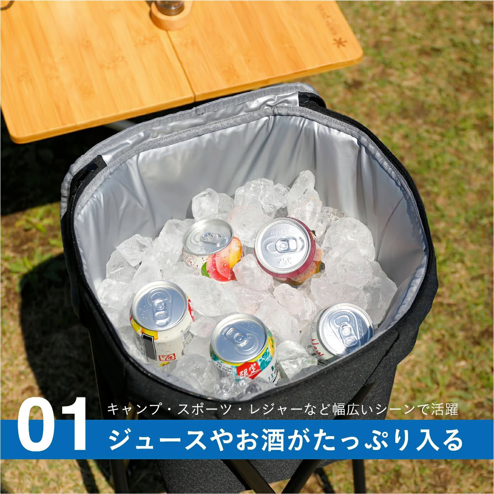 4本のスチール製スタンドを差し込めば、地面の上でも安定して自立。高さもあり、地面の熱を避けられるので保冷効果をキープしやすい設計です。設置も簡単で、すぐに使い始められます。