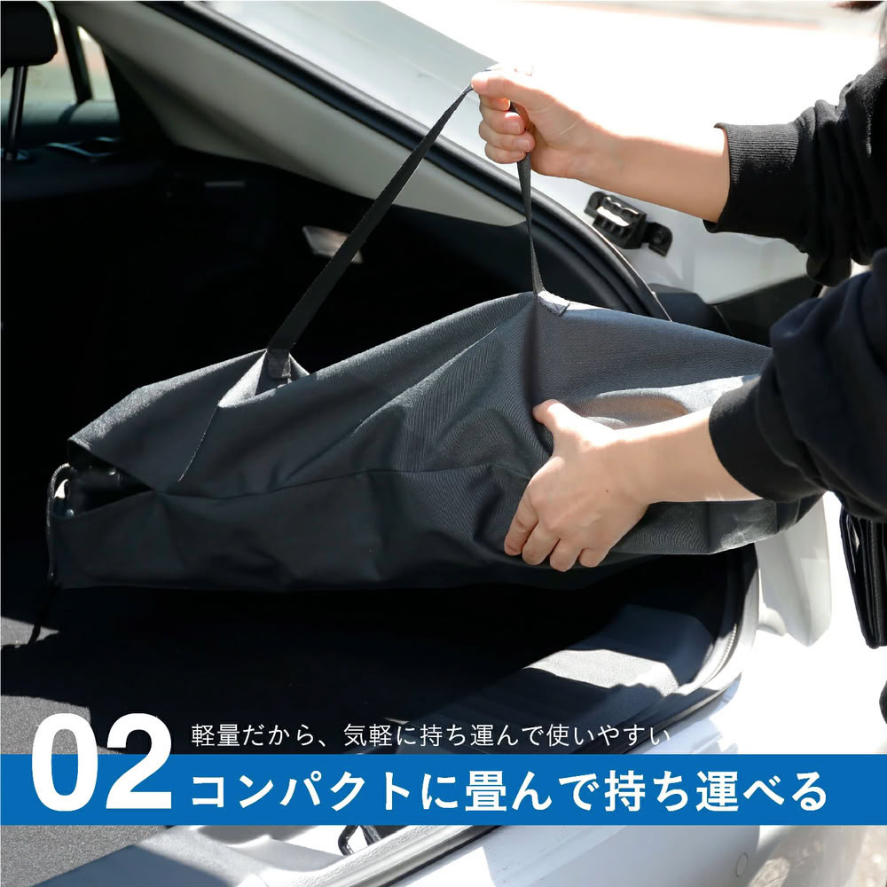 使わないときはコンパクトに折りたたみ可能。収納袋付きなので、場所をとらず車のトランクや玄関にもサッとしまえます。