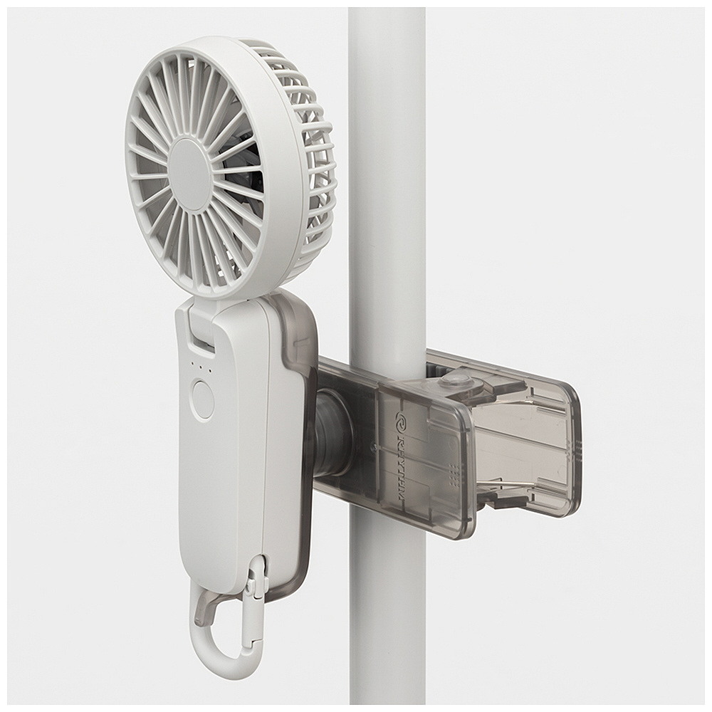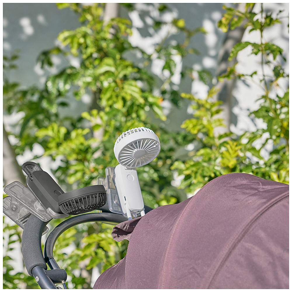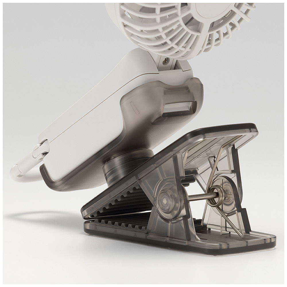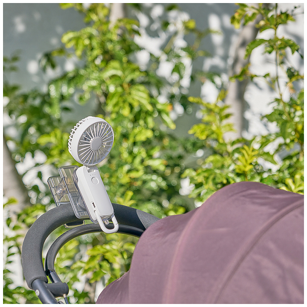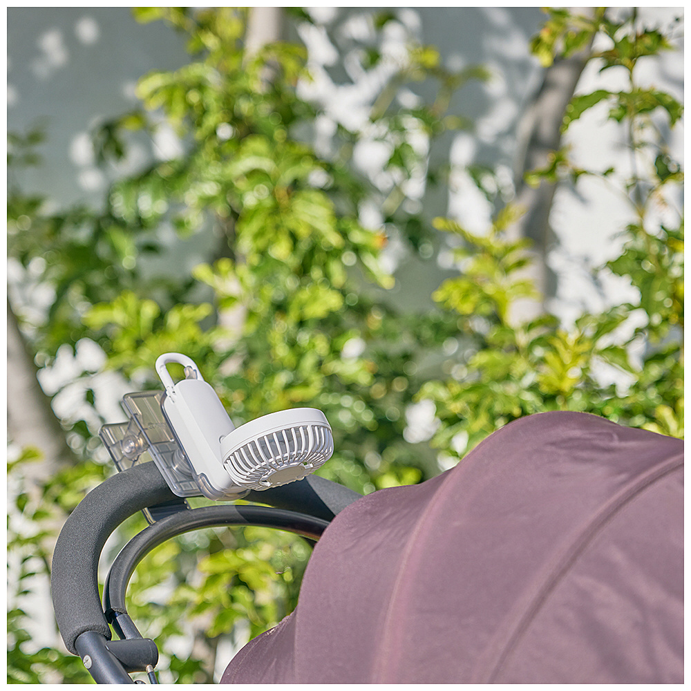 ■大きなクリップでベビーカーなどに固定し、回転するので方向を変えられます。