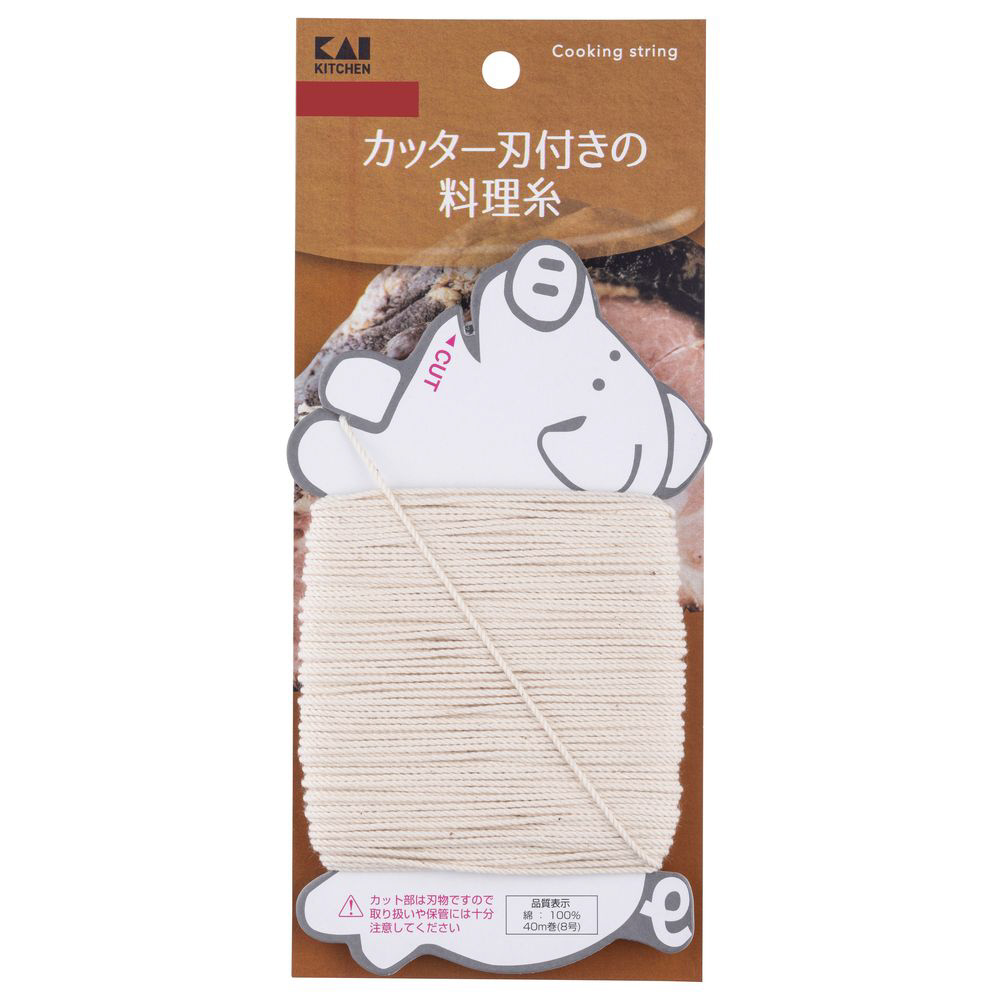 煮豚や焼きブタなどかたまり肉の巻き付けや、巻物料理、包み料理のまとめに便利な、料理糸8号(40m巻)です。カッター刃が付いているので、そのまま糸を切ることができます。